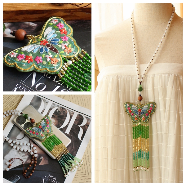 微瑕,处理清货! 双面手绣刺绣流苏新中式绿金蝴蝶项链长项链