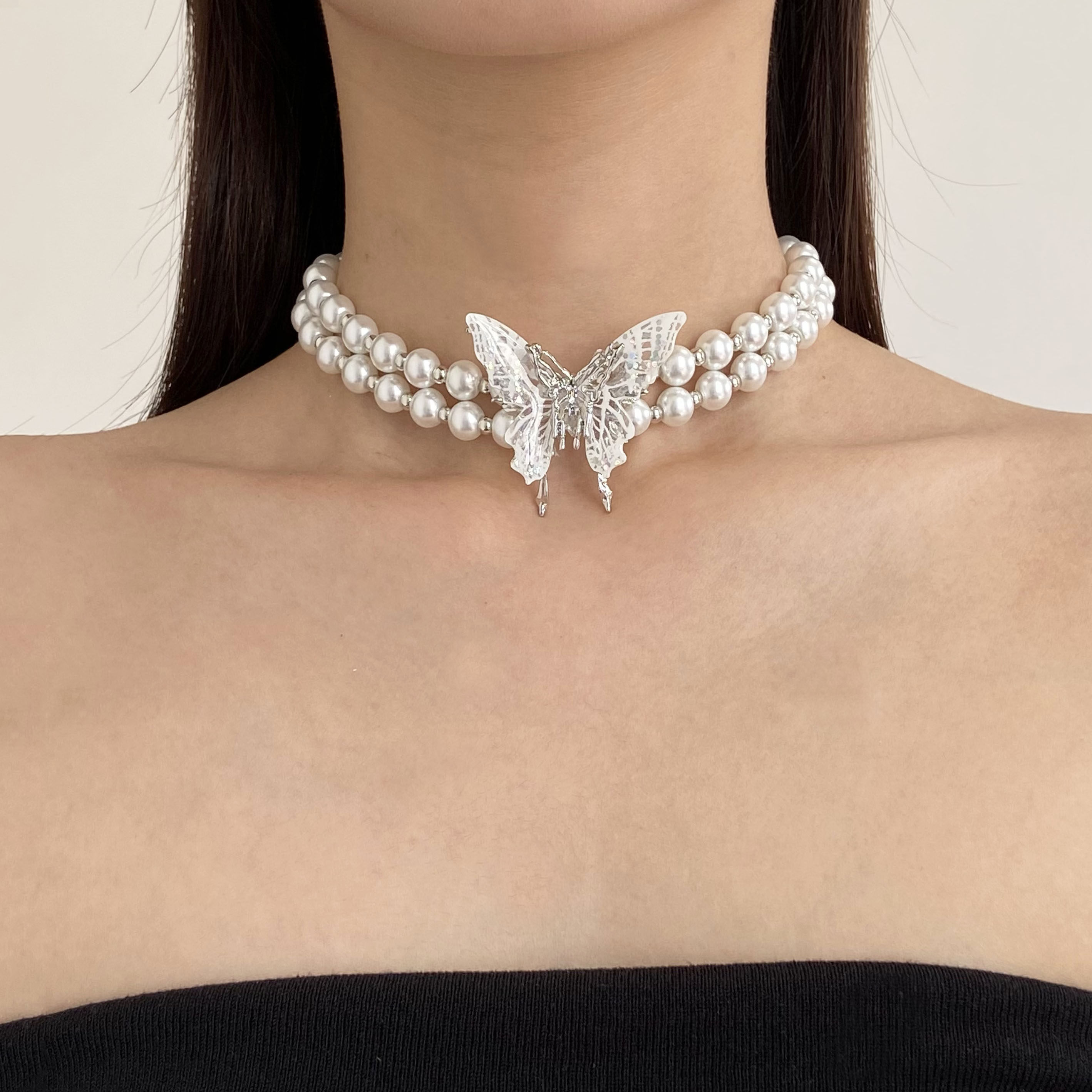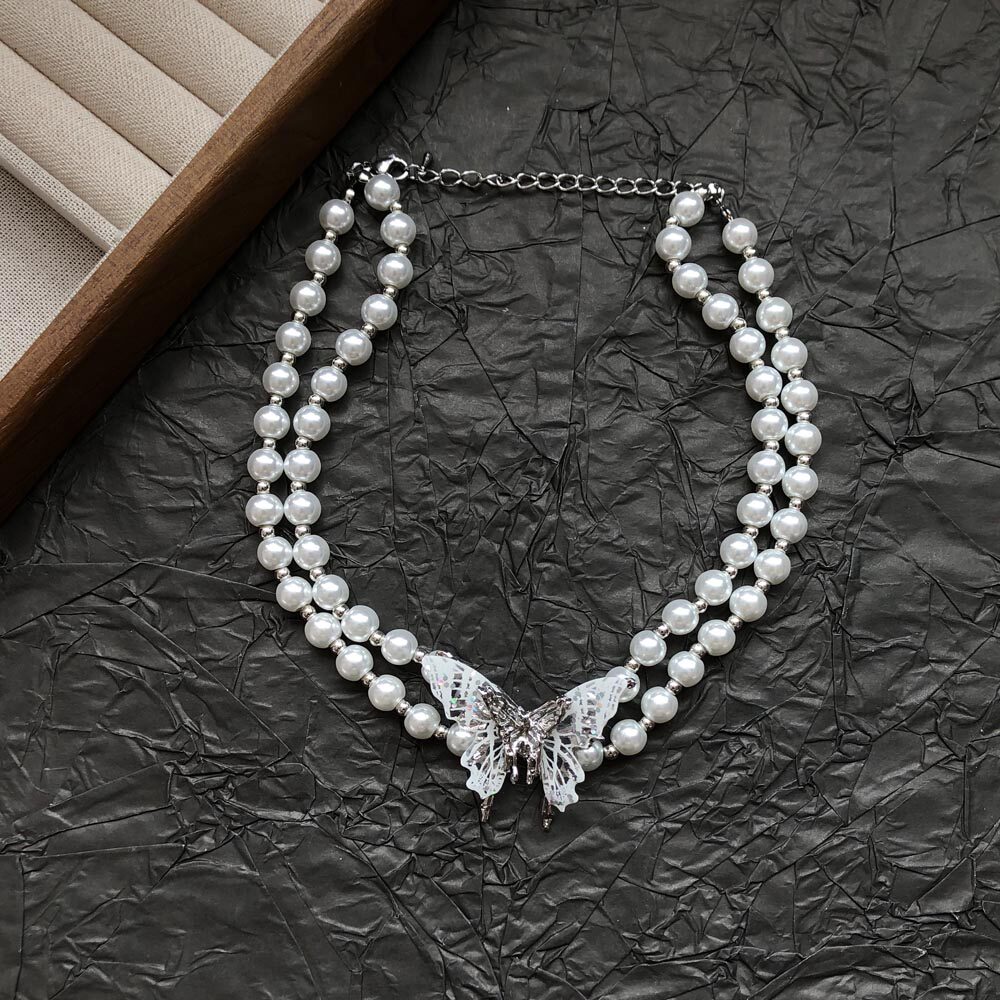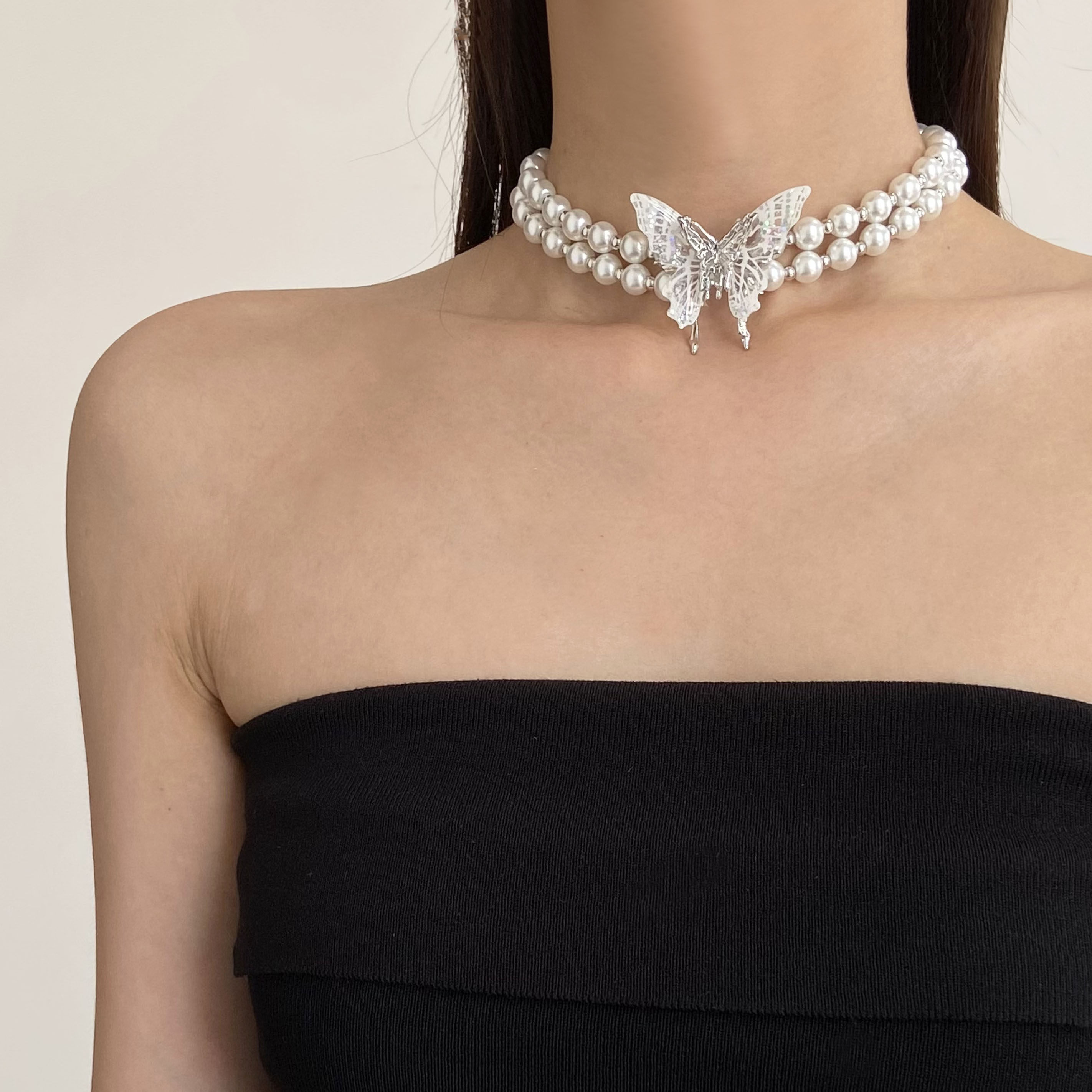 法式镶钻金属蝴蝶双层珍珠项链女时尚超仙高级感锁骨链choker颈链