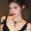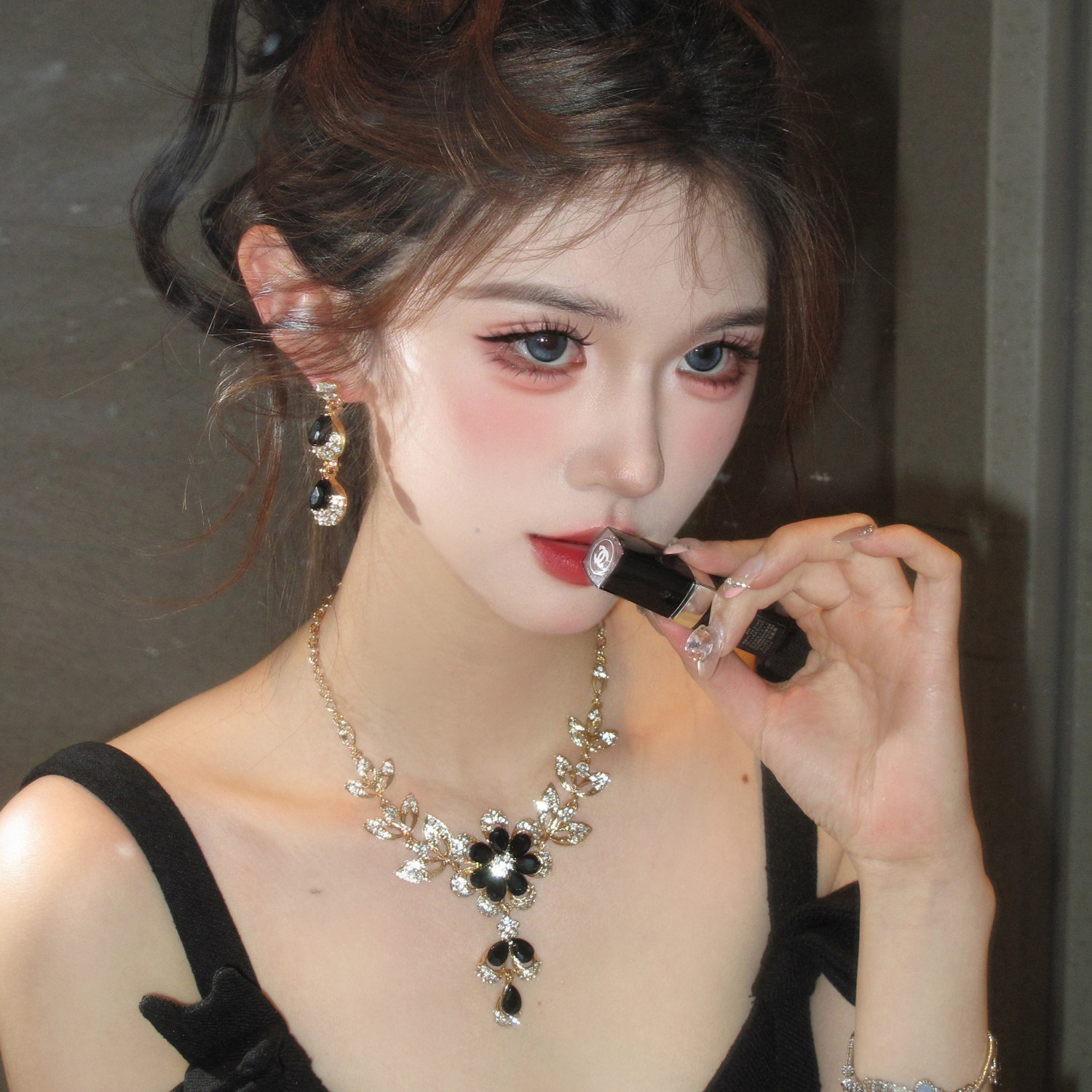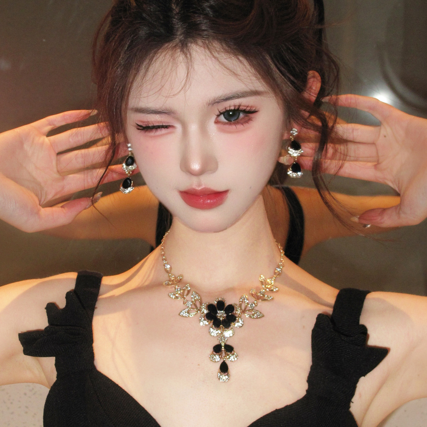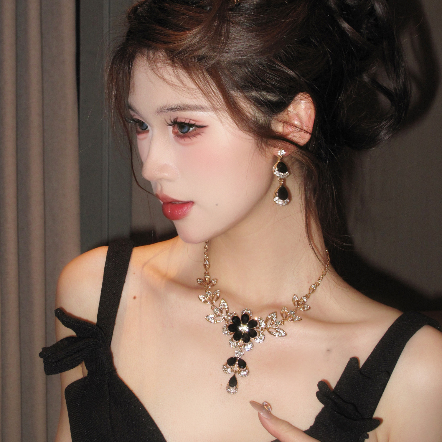 超闪镶钻黑色水滴花朵流苏项链耳环名媛精致锁骨链轻奢高级感套装