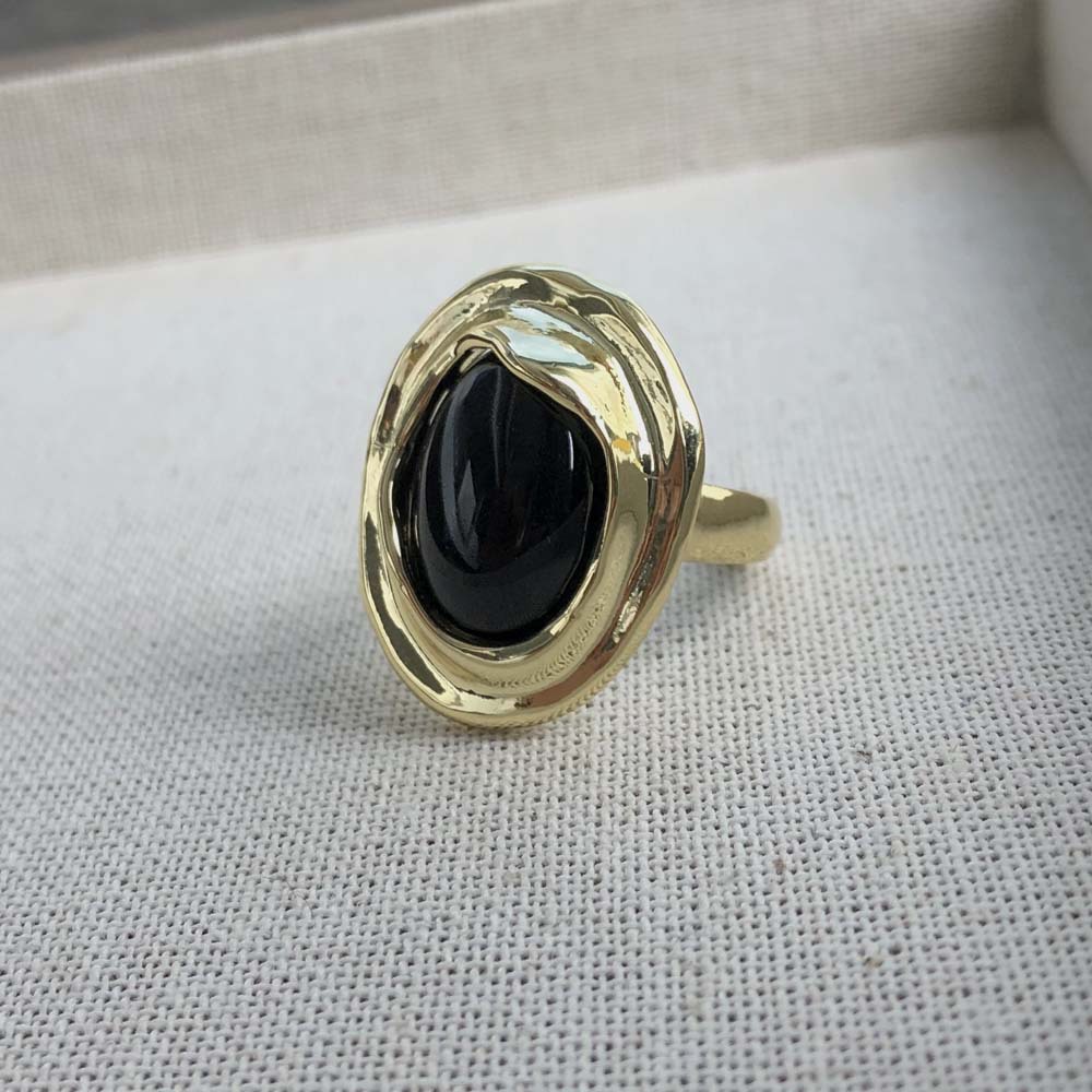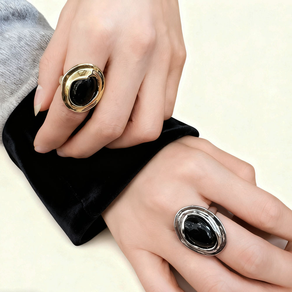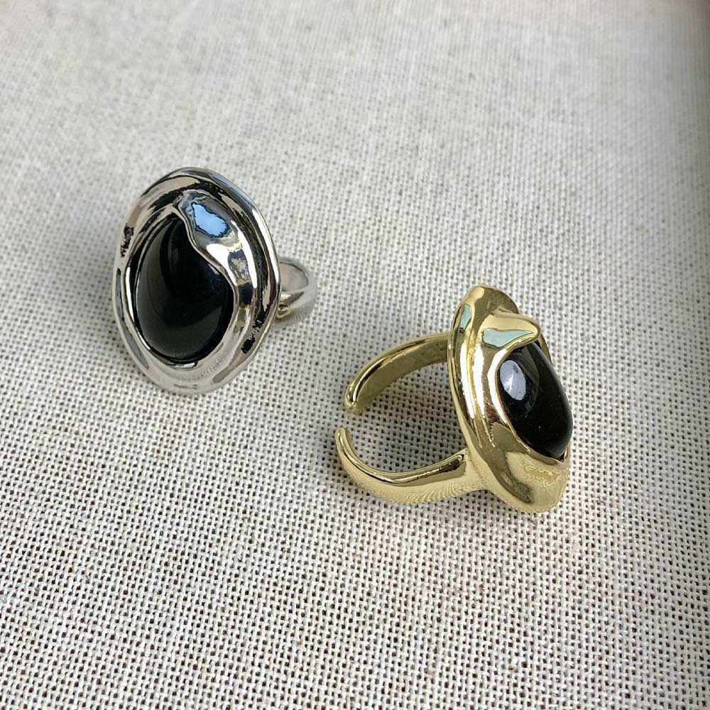欧美朋克不规则金属边黑曜石镶嵌夸张开口戒指女简约气质无名指环