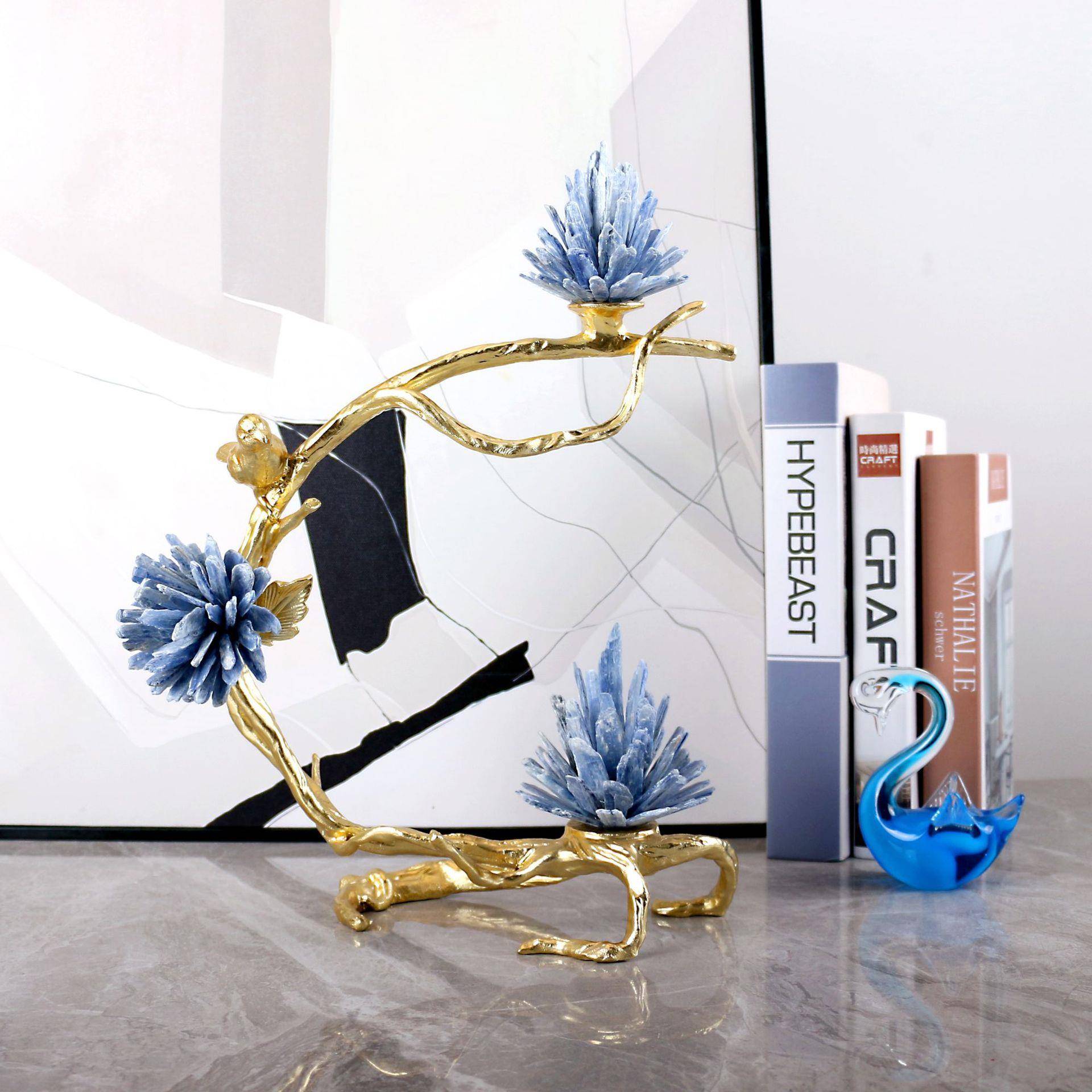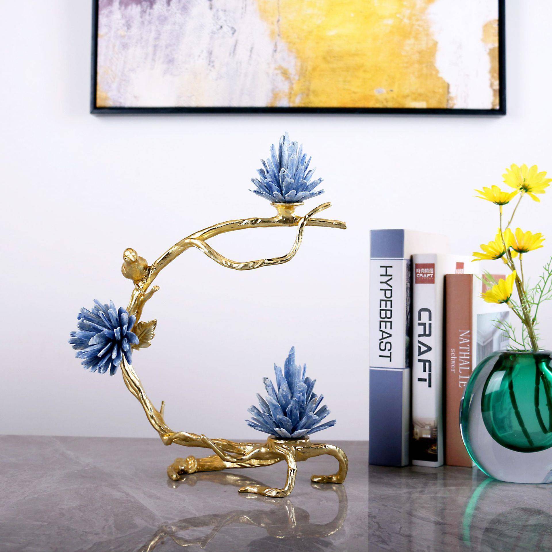 轻奢蓝色天然石鸟语花香摆件金属新中式客厅电视柜家居软装饰品