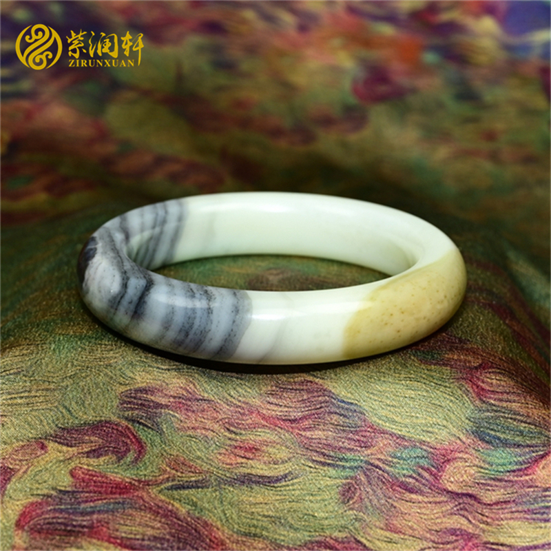 紫润轩新疆和田玉糖白玉水墨青花手镯56 8MM且末料三色大美传家