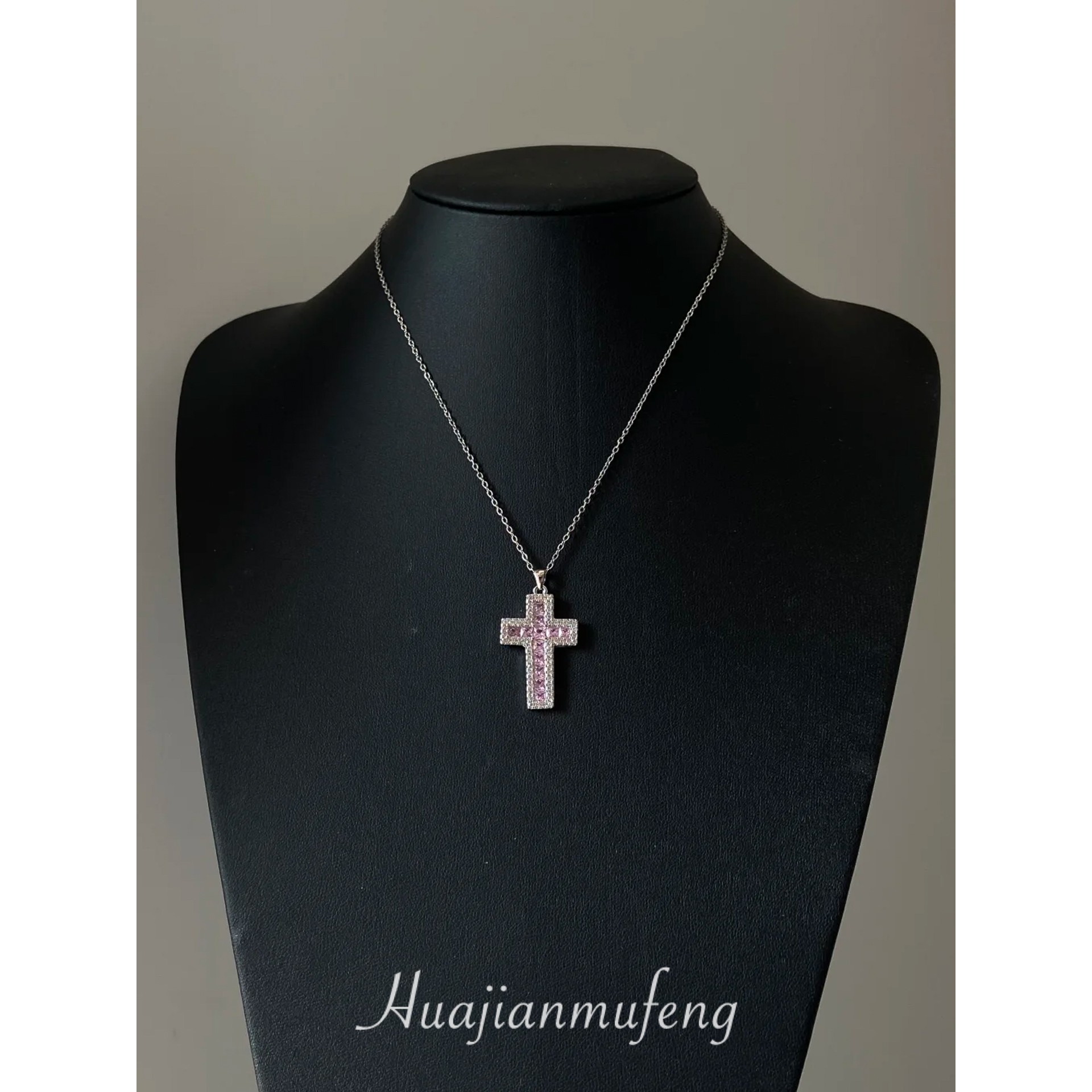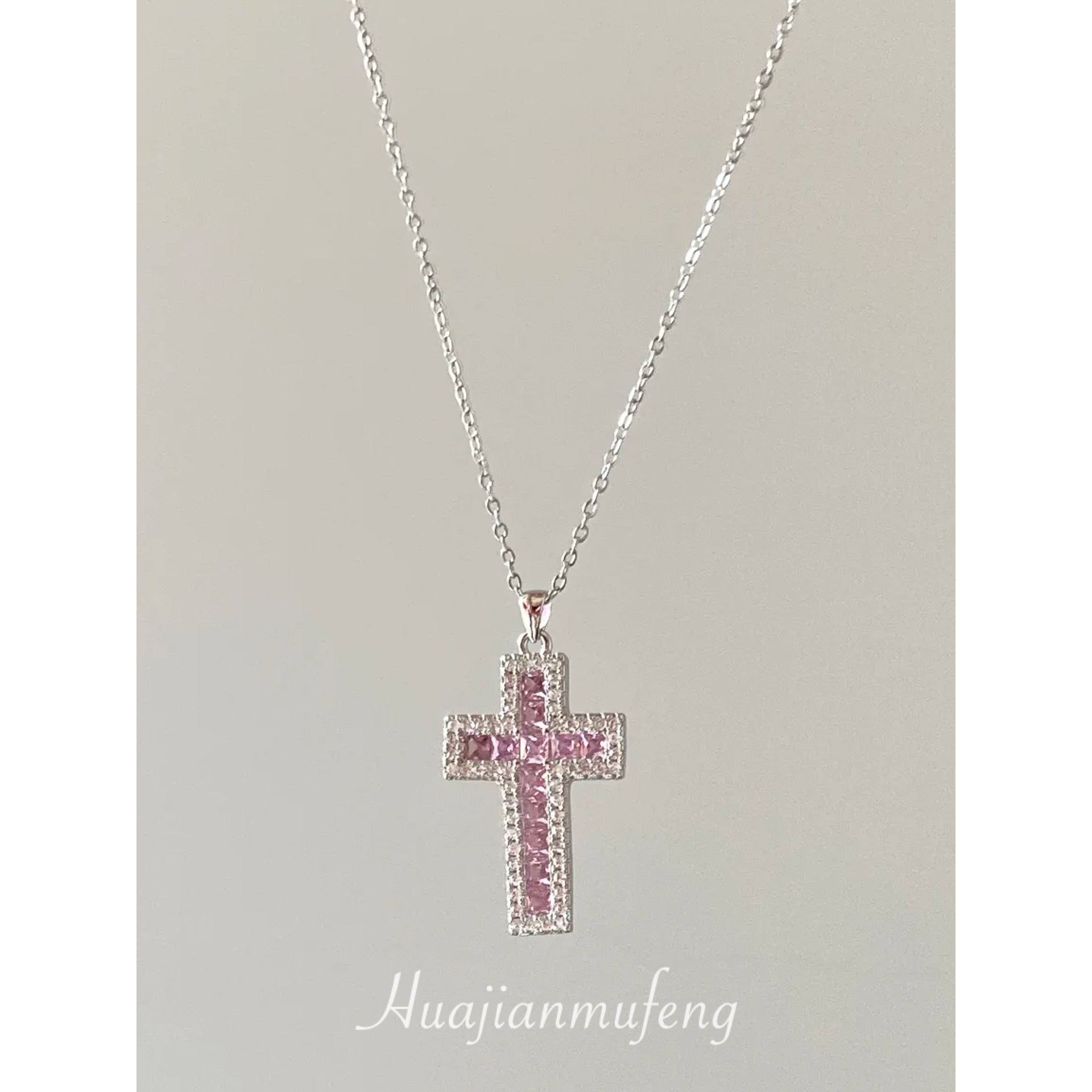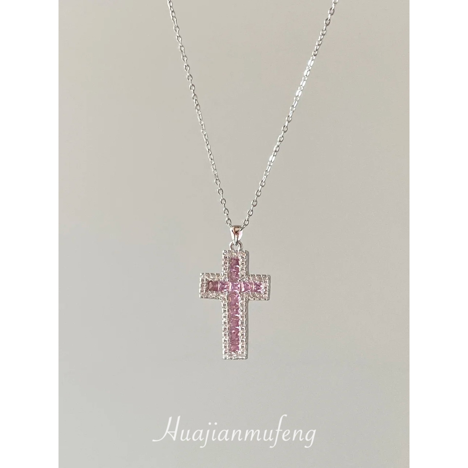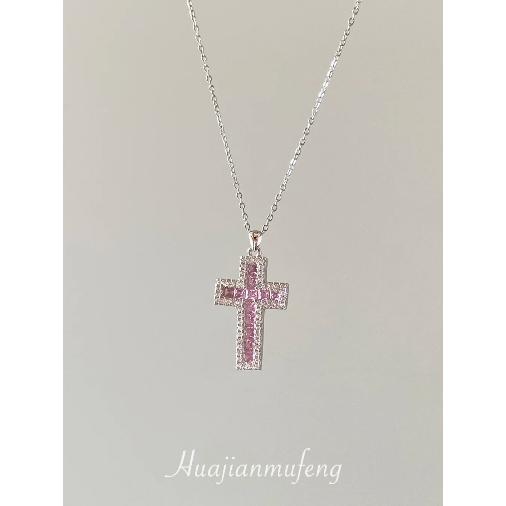 甜酷风粉色满钻十字架项链高级感轻奢小众锁骨链精致时尚辣妹配饰