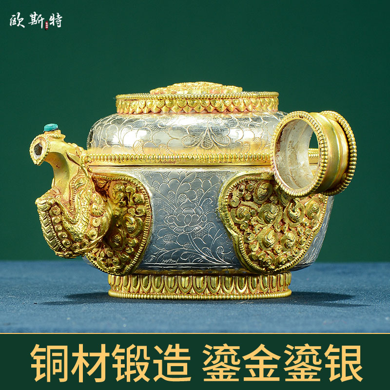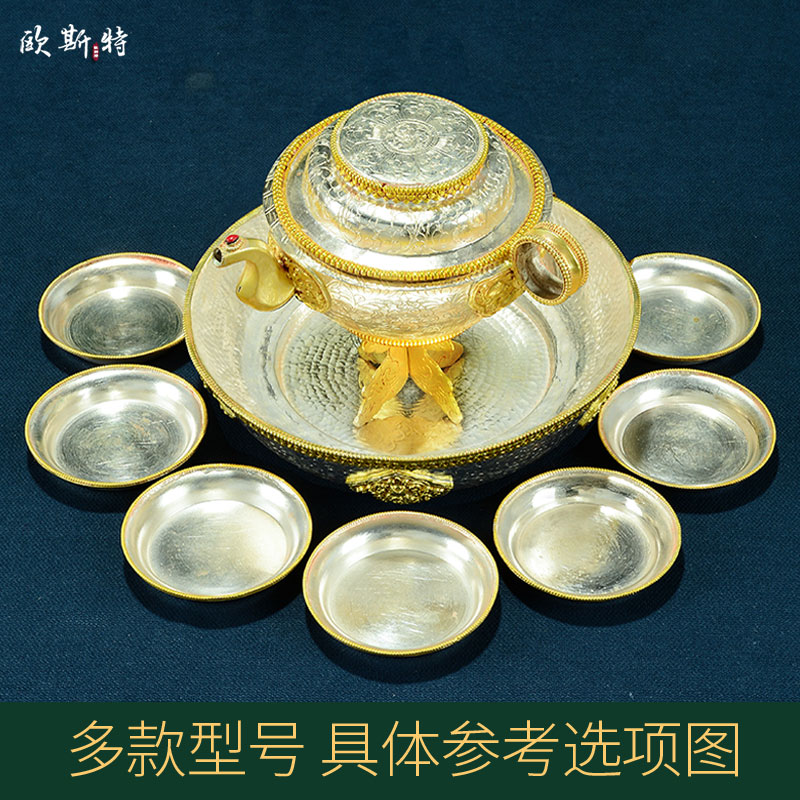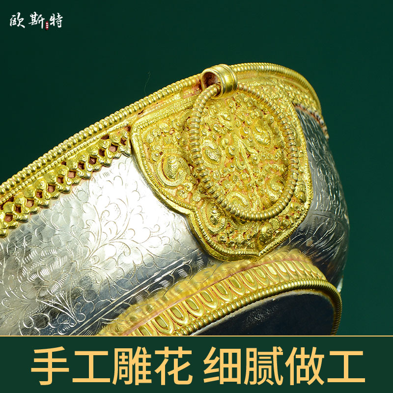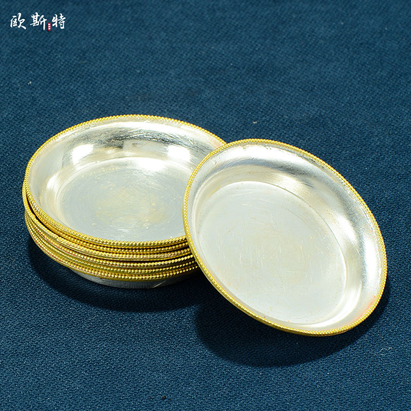 藏式水陆供盘 尼泊尔手工艺品铜器 铜鎏金雕花装饰碗 供水碗摆件