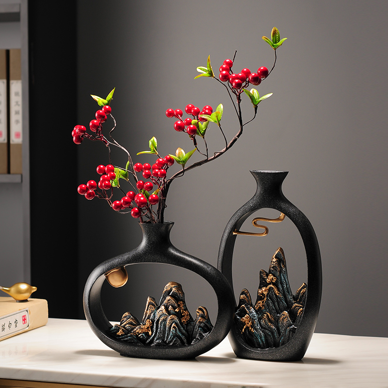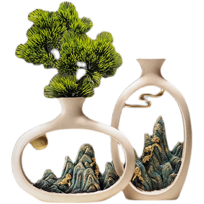 新中式花瓶摆件客厅插花玄关电视柜迎客松屏风装饰禅意博古架摆设