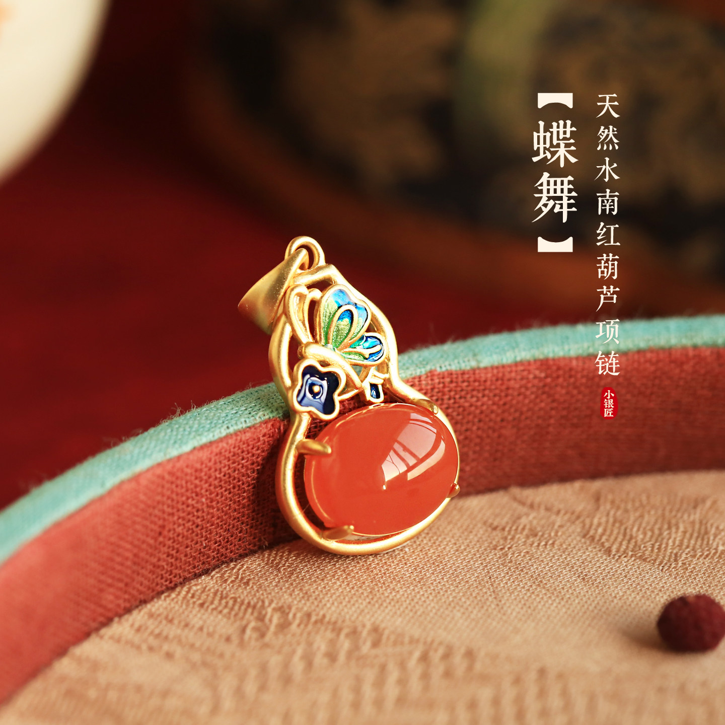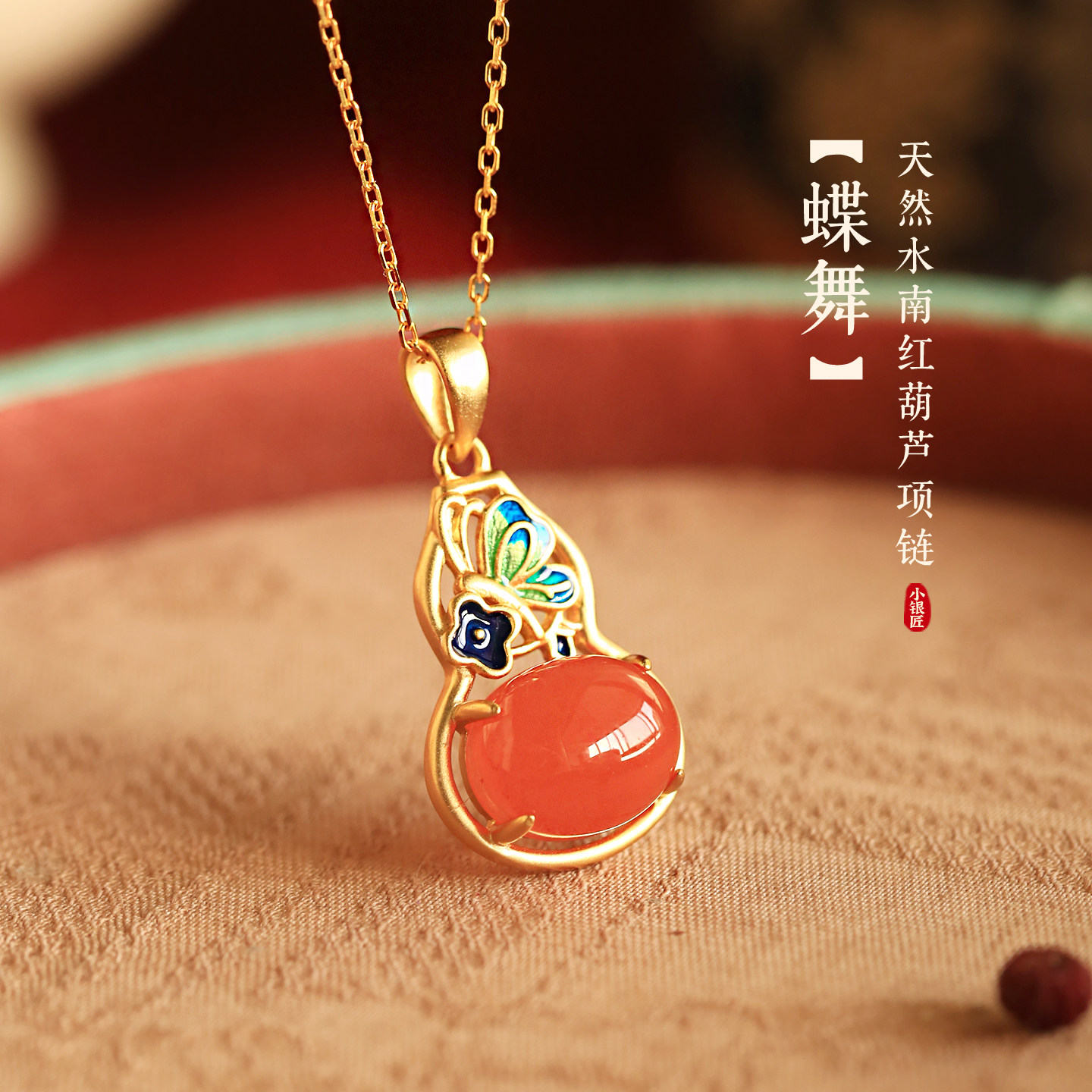 天然南红纯银珐琅葫芦吊坠女中式国风红玛瑙红色金包银锁骨链项链