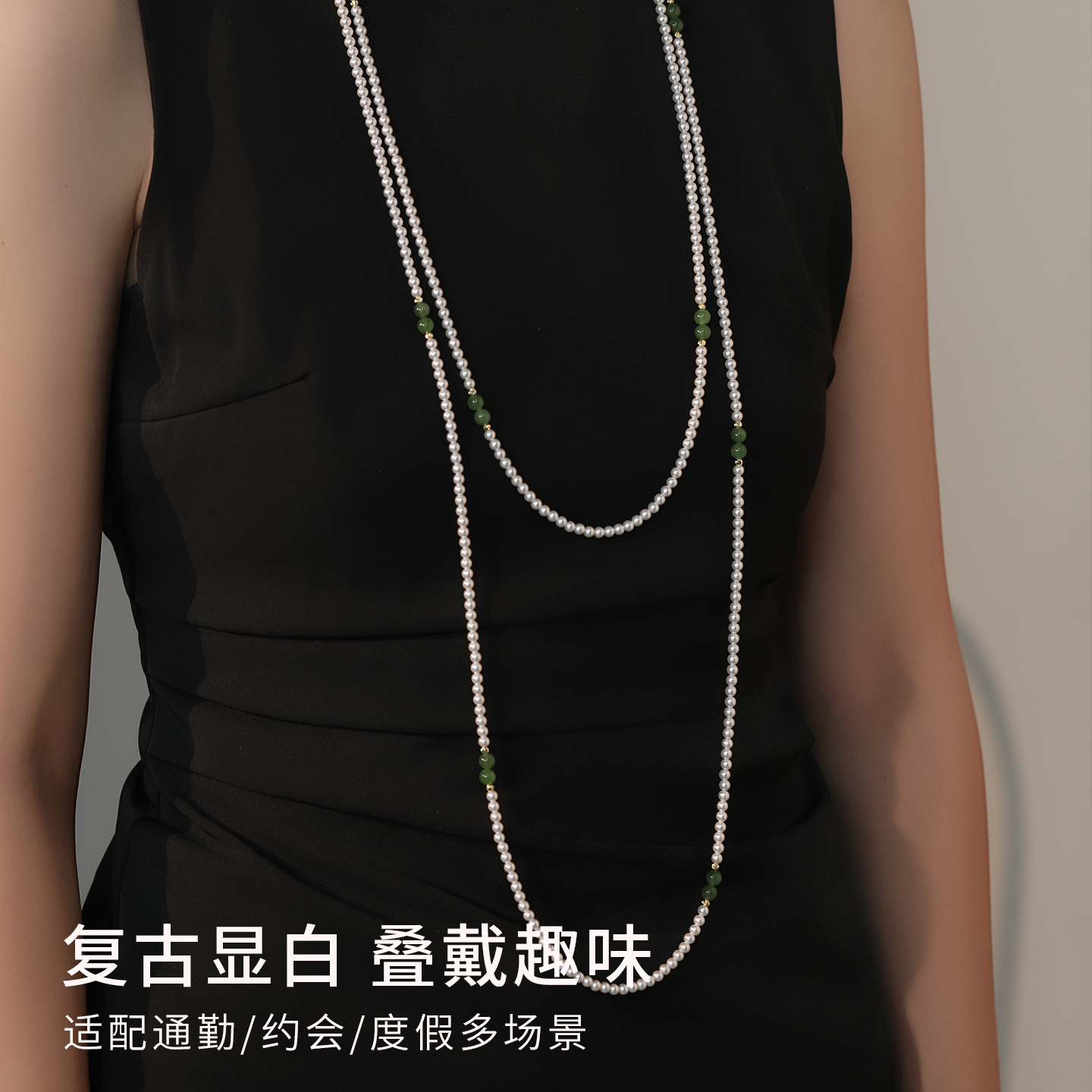 SHIWU新中式和田玉珍珠项链长款毛衣链秋冬双层叠戴颈链2025新款