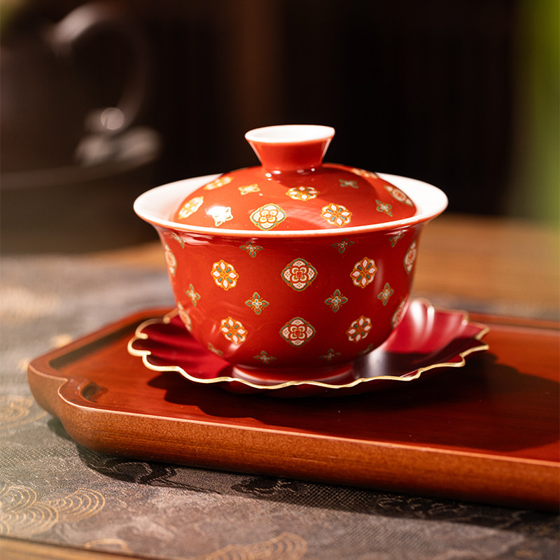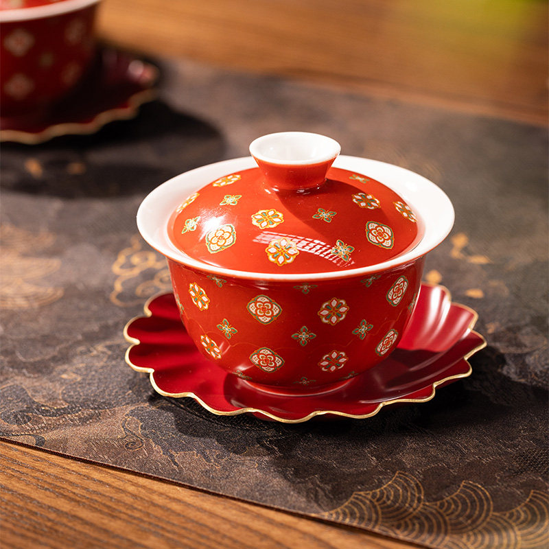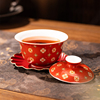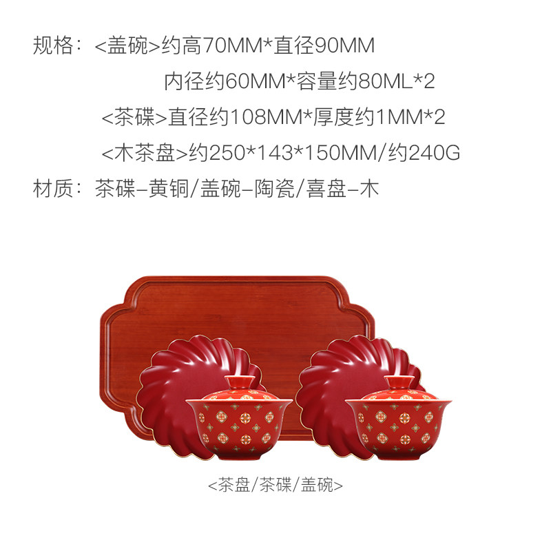 朱炳仁铜岁月皆欢禧喜礼套装精致红色喜庆盖碗茶碟茶盘结婚用品