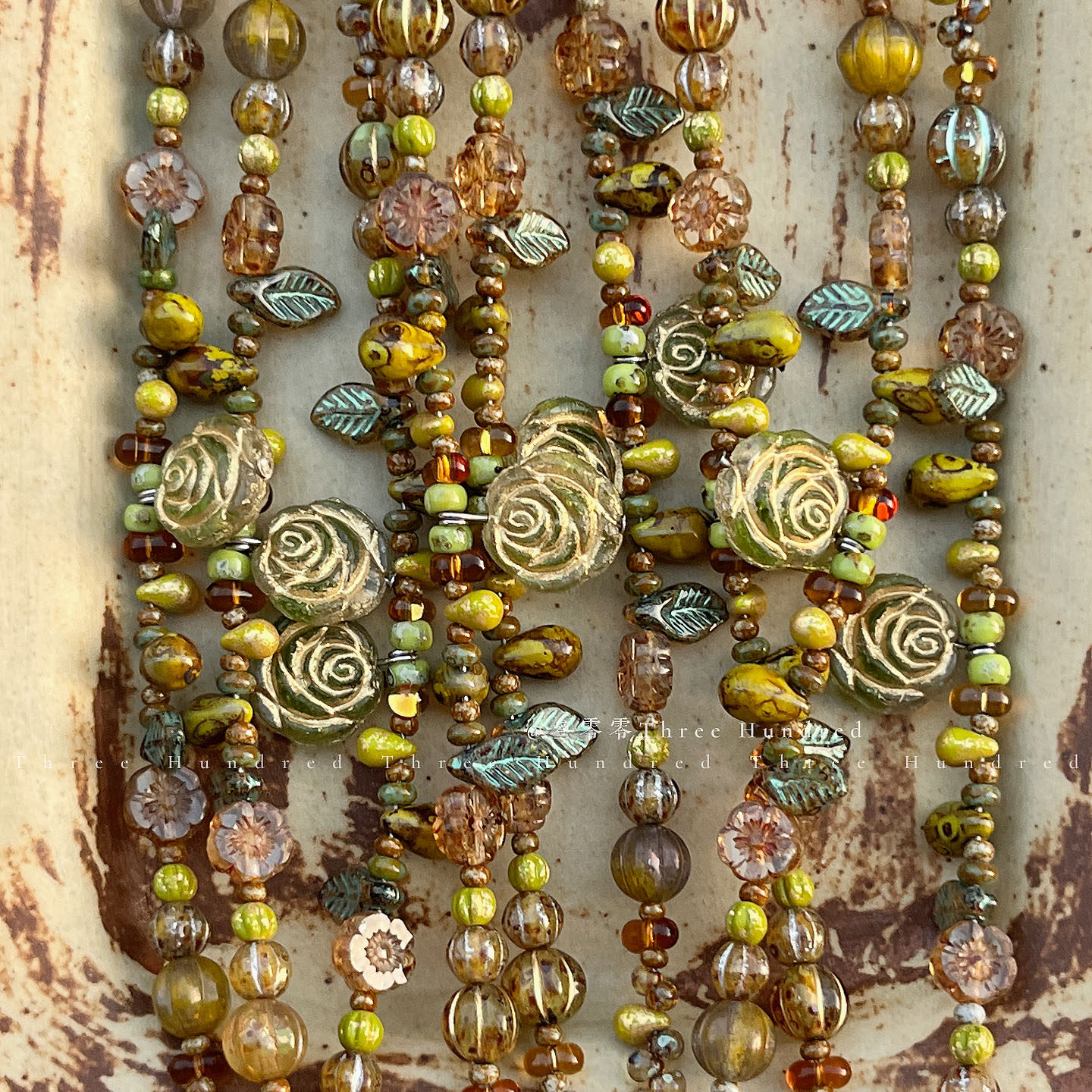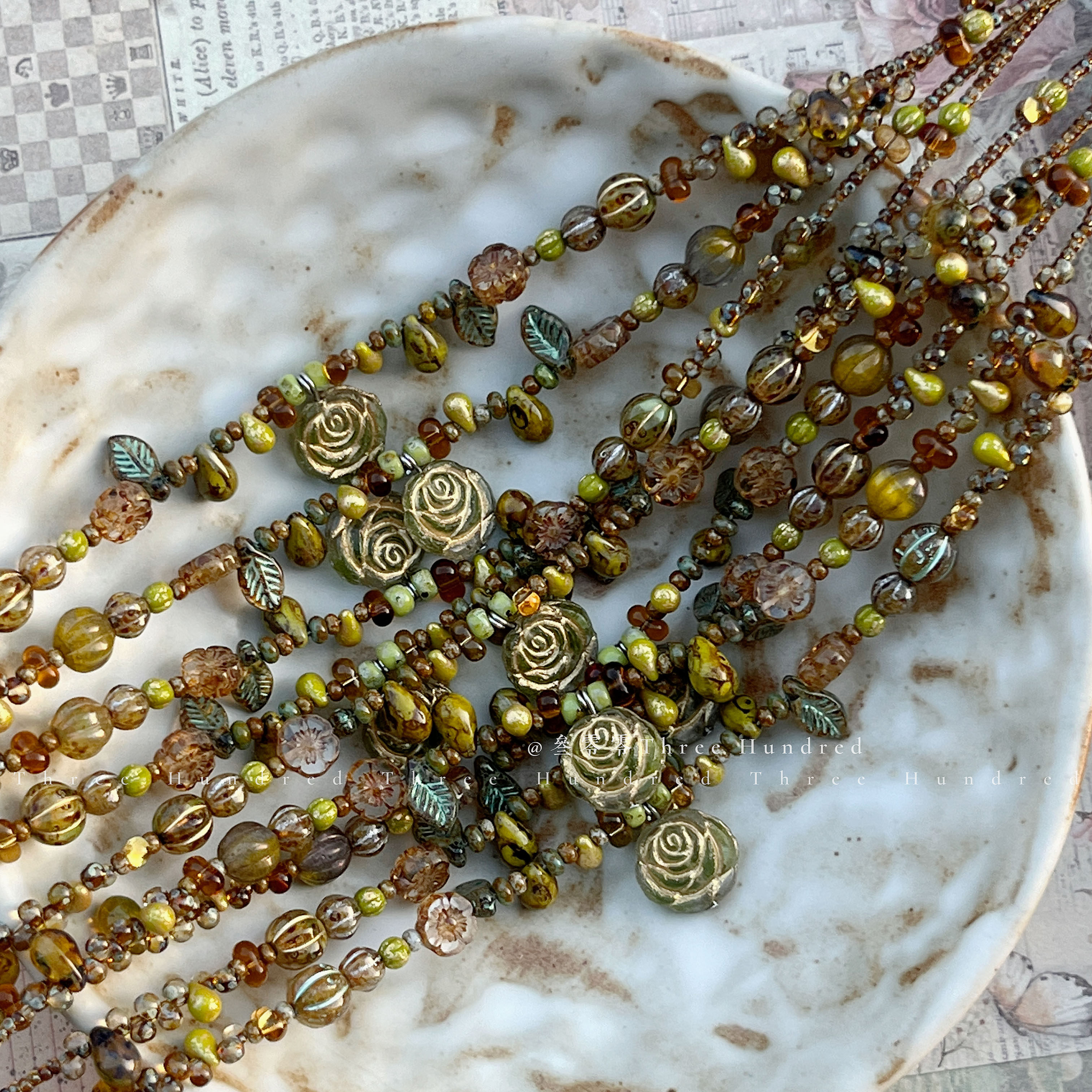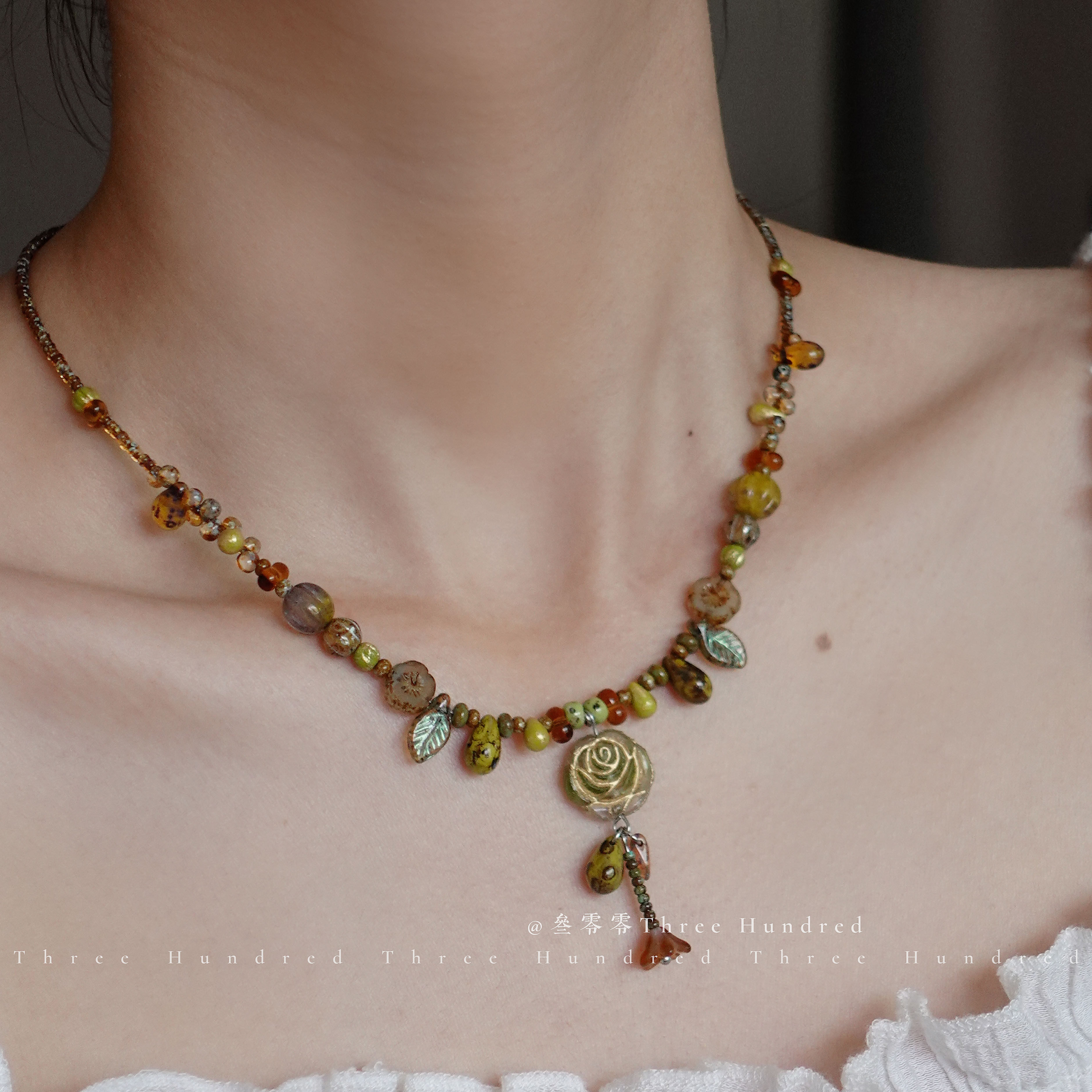 叁零零原创•苔藓玫瑰 vintage绿色项链饰品吊坠捷克琉璃复古女