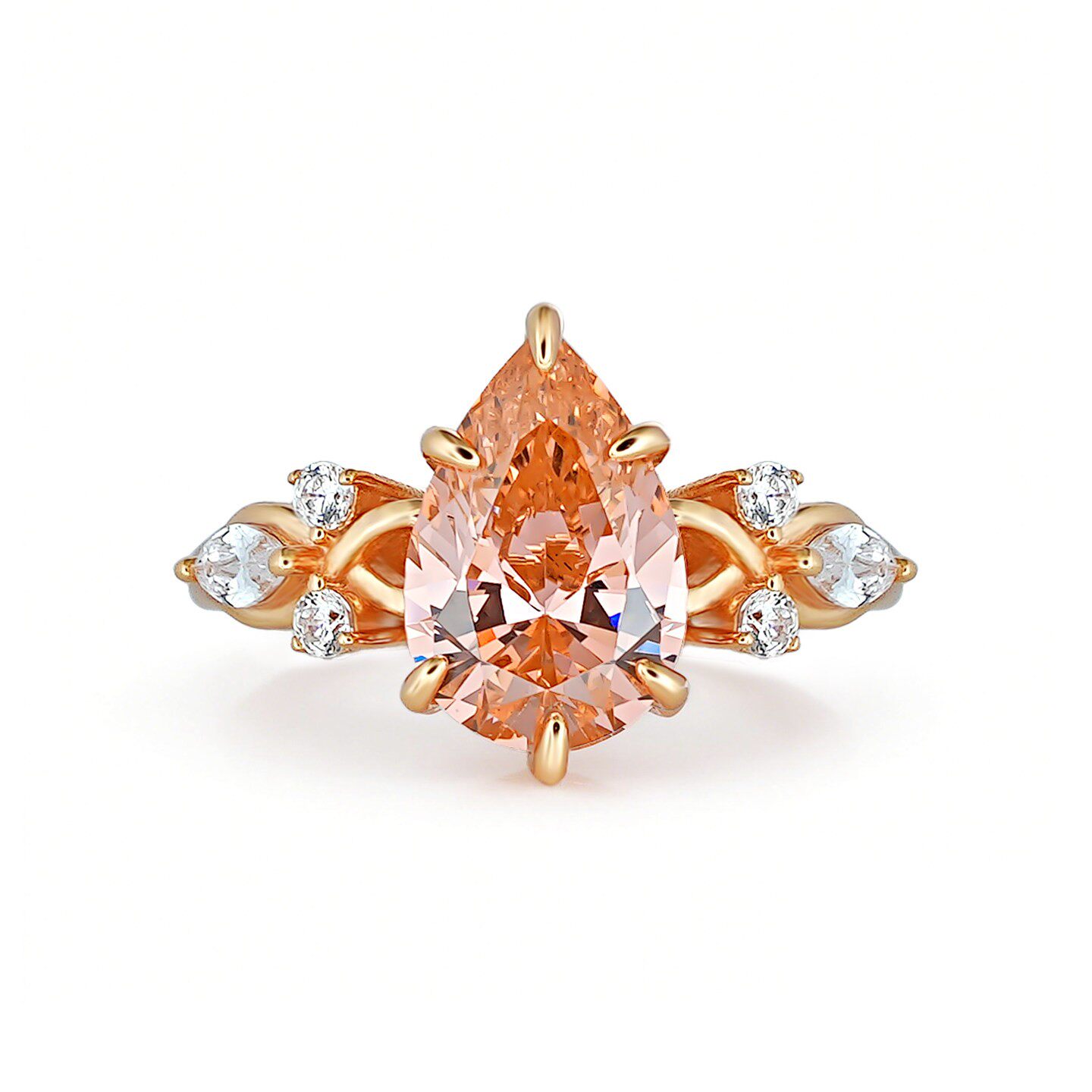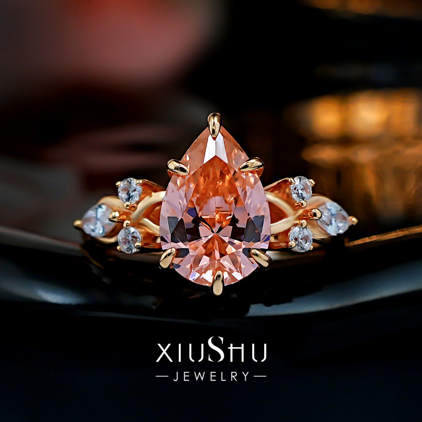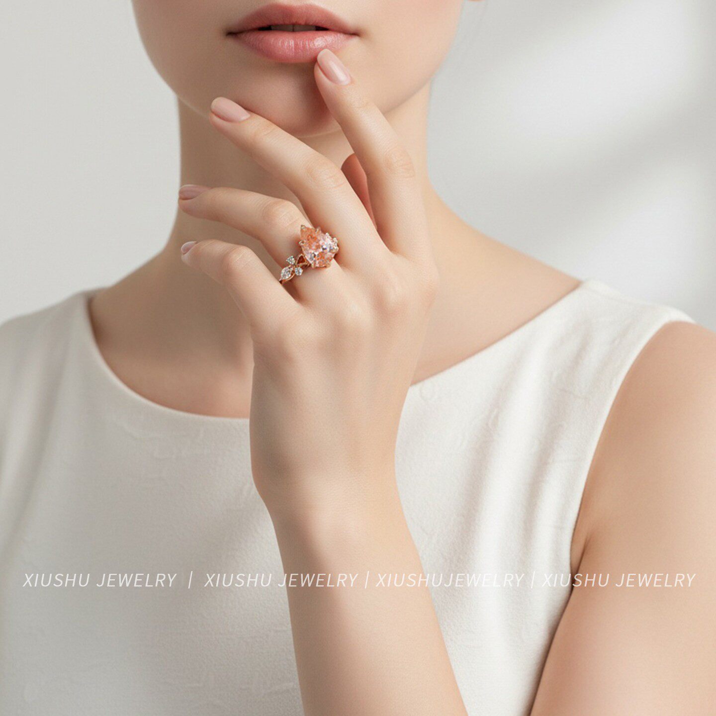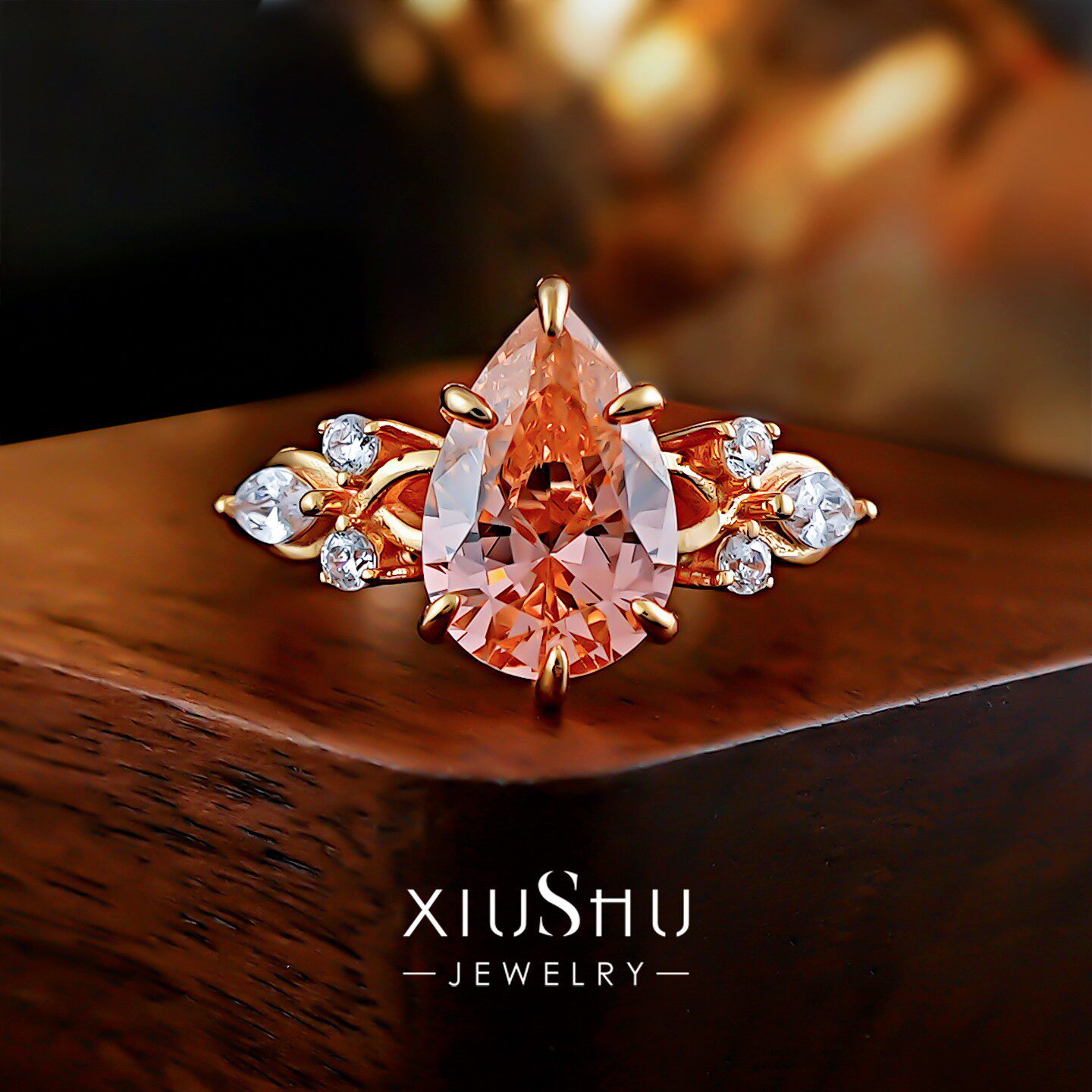 4ct《柔焰轻羽》帕帕拉恰粉橙色925银戒指温柔甜美水滴镀玫瑰金托
