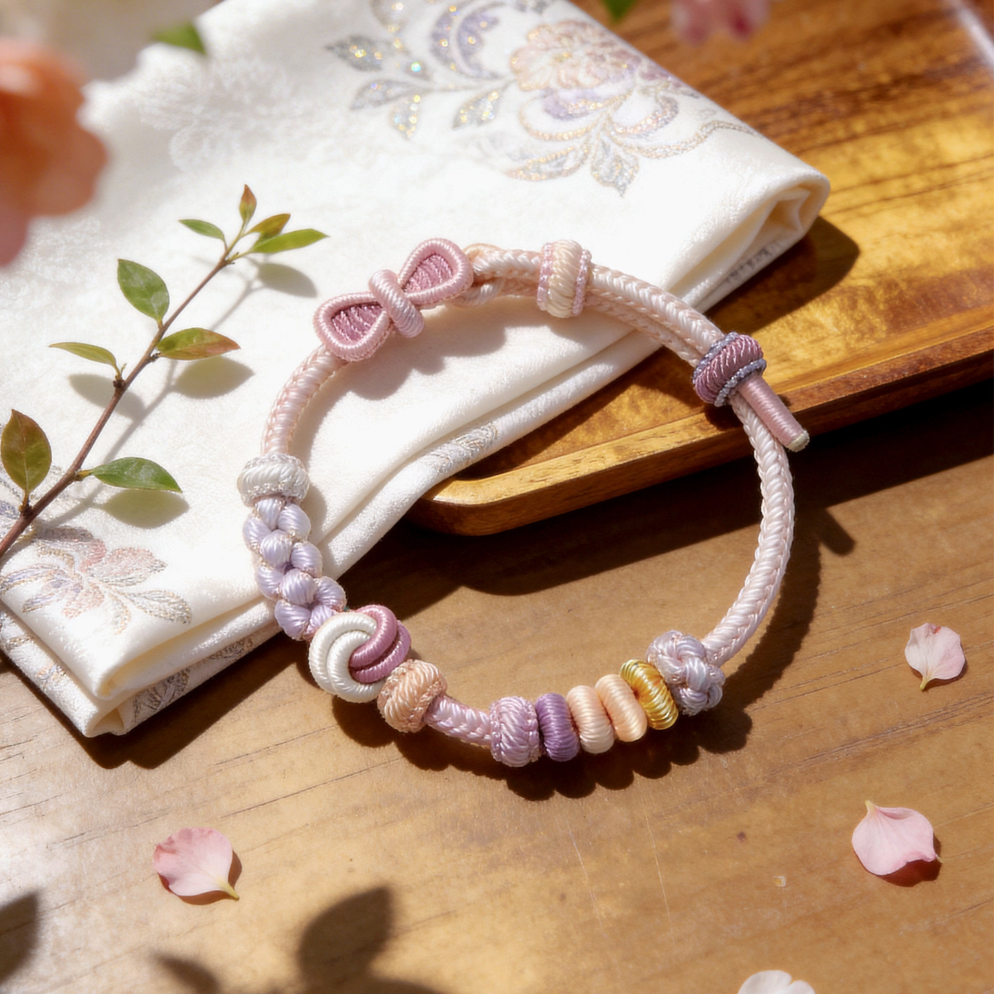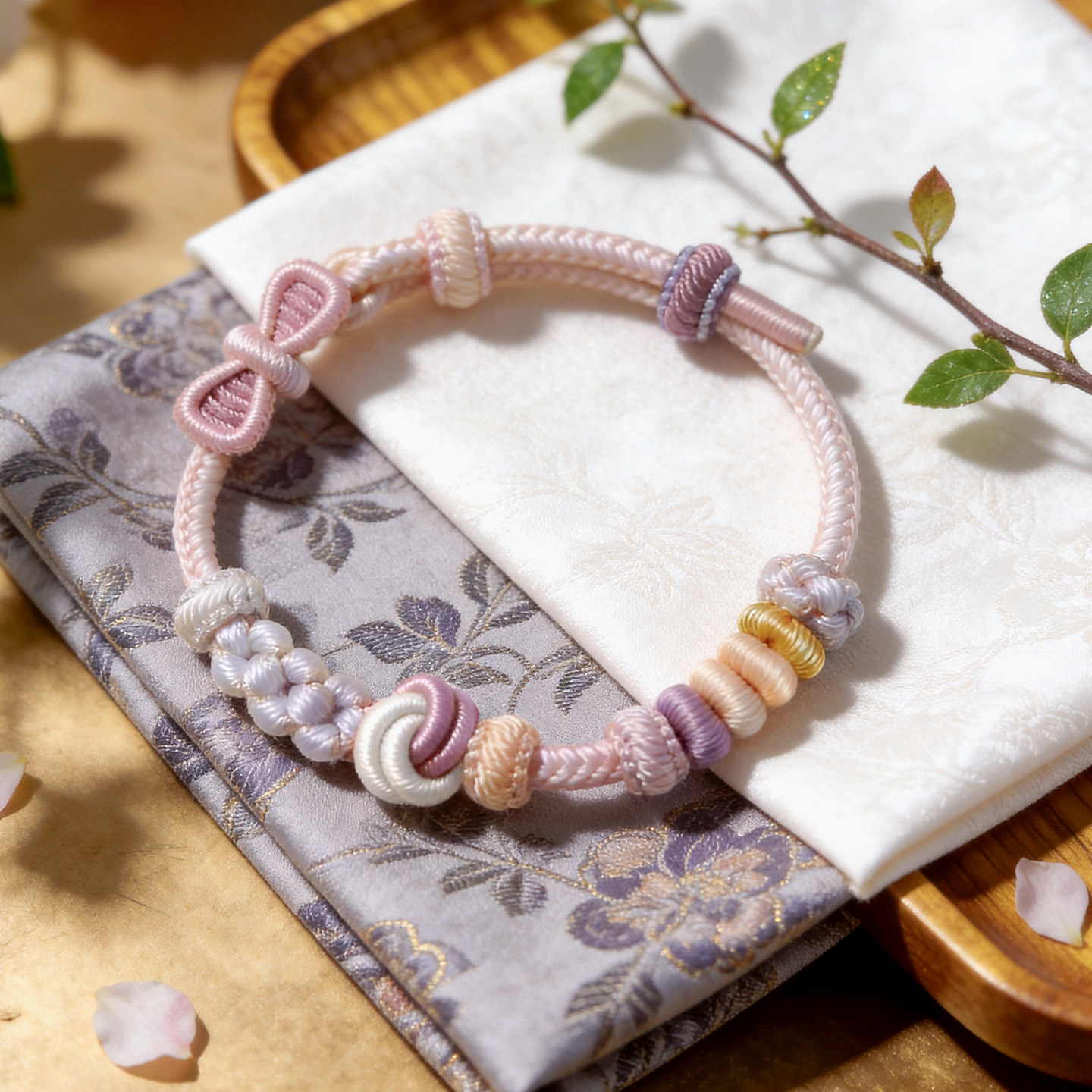 温柔风手工编织绳蝴蝶结紫色手绳可穿珠黄金转运珠可调节编绳手链