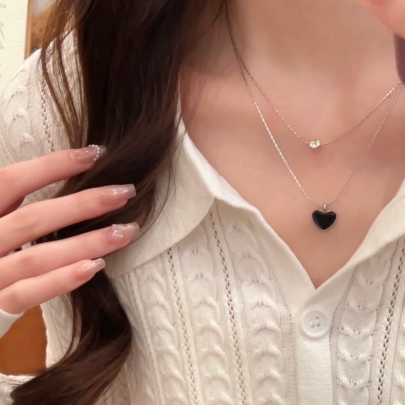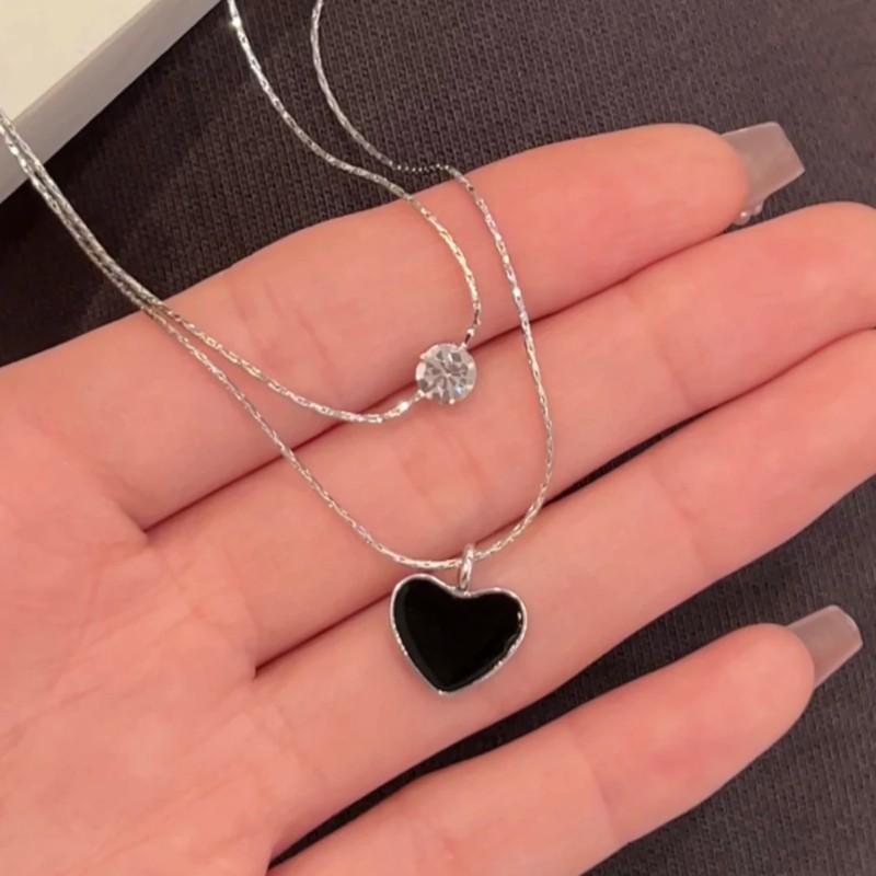 双层闪钻黑色爱心项链韩系甜酷风锁骨链夏季气质百搭高级颈链饰品