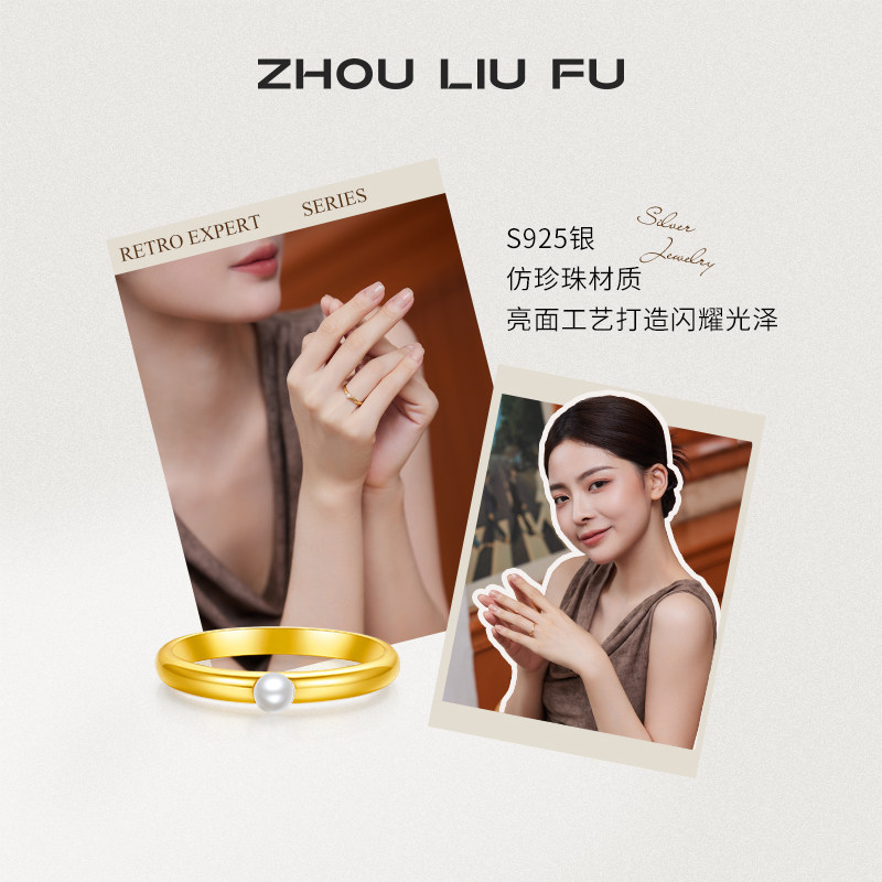 周六福珍珠戒指贝珠S925银黄金色简洁单珠指环手饰圣诞礼物