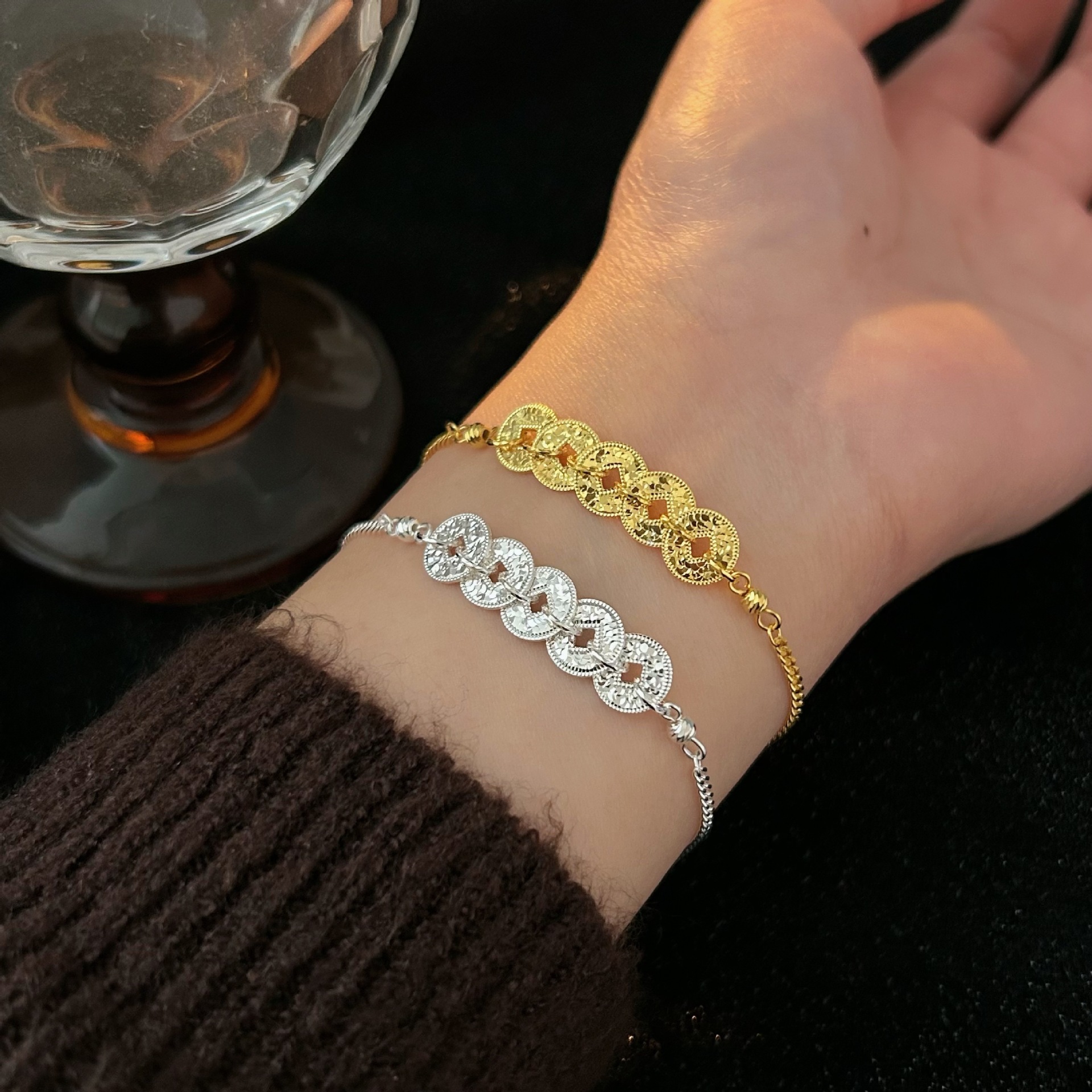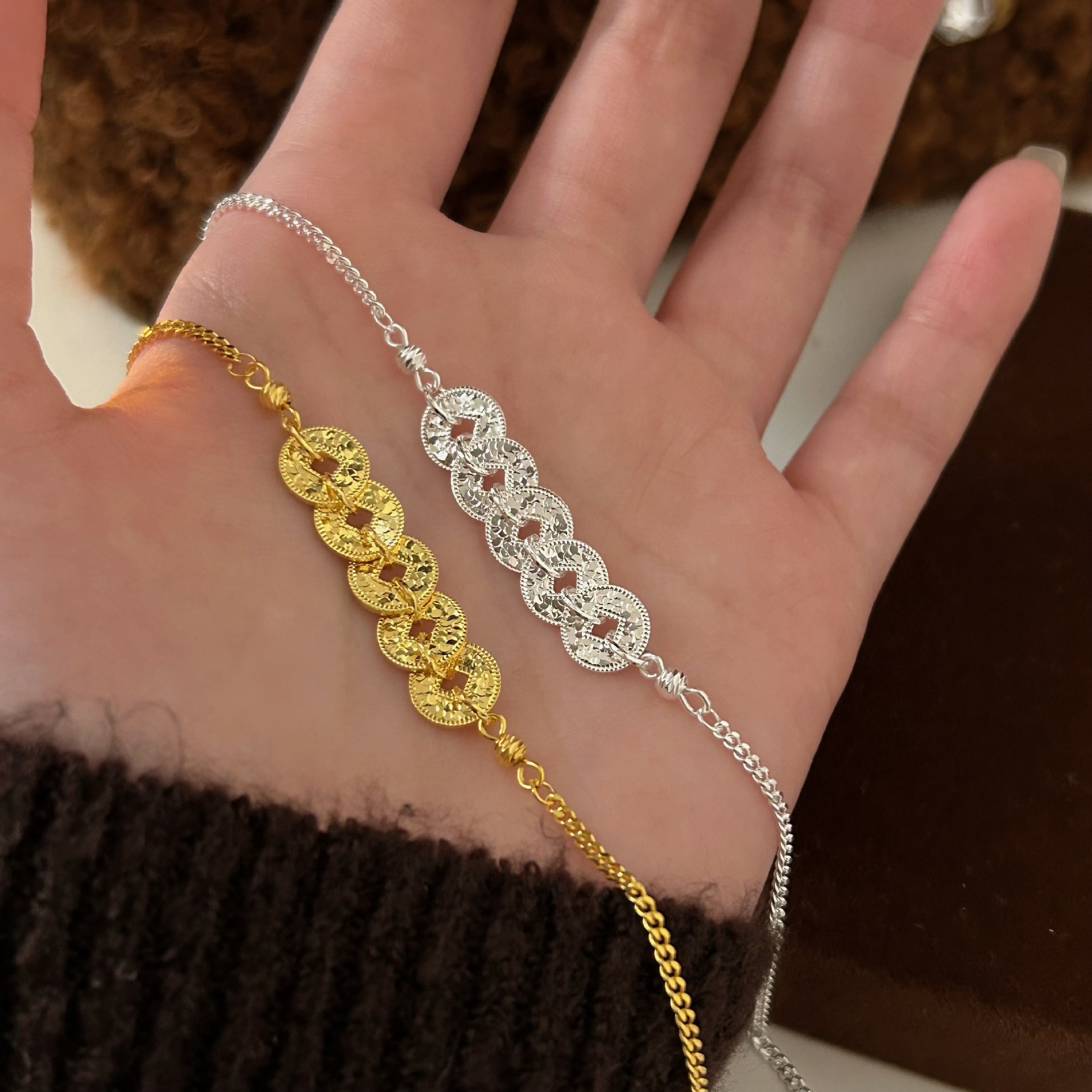 新款 S纯银爆闪碎碎冰五帝钱币黄金手链女轻奢小众精致百搭手饰