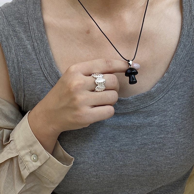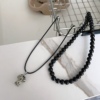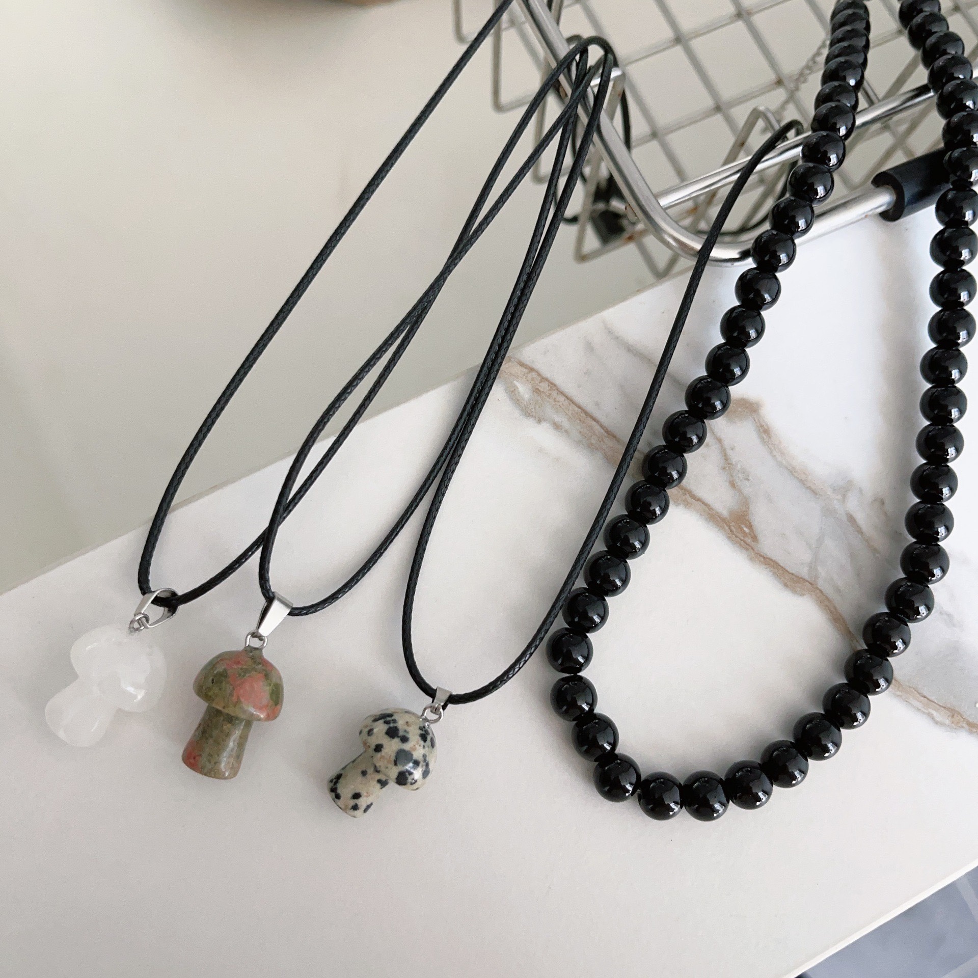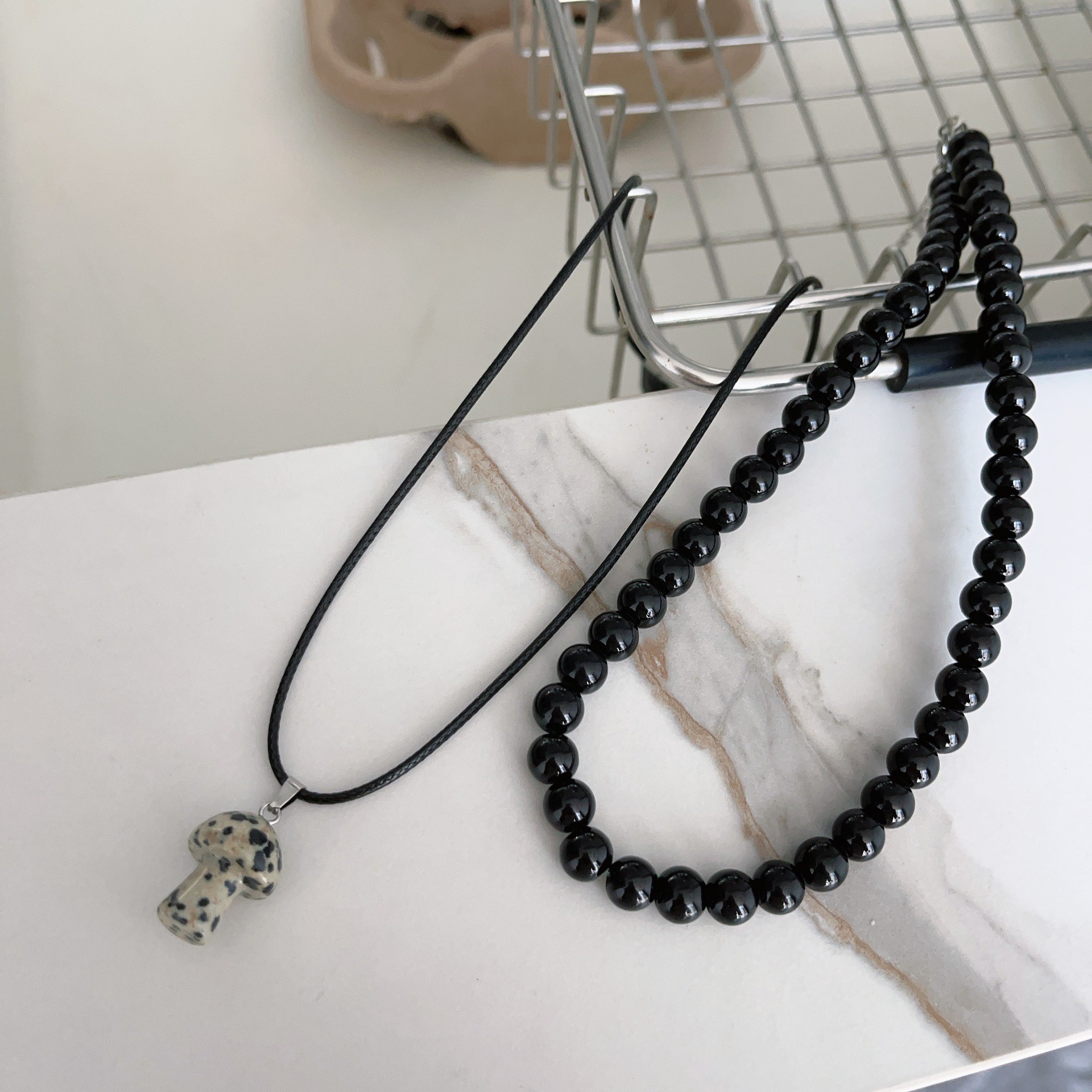 天然石蘑菇吊坠项链黑色珍珠叠戴ins百搭设计感小众串珠锁骨链女