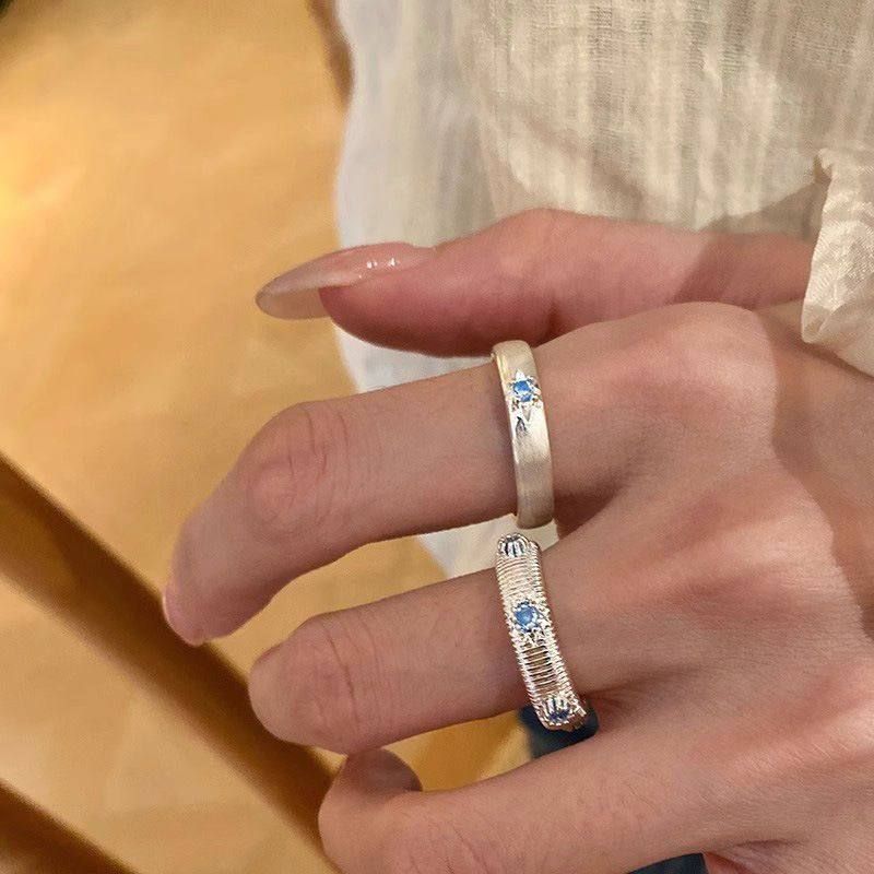 S925纯银蓝色锆石星芒戒指个性中古风vintage高级感拉丝条纹指环
