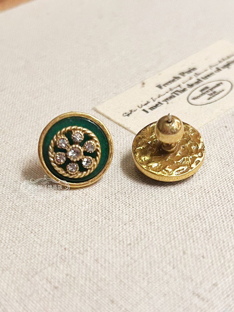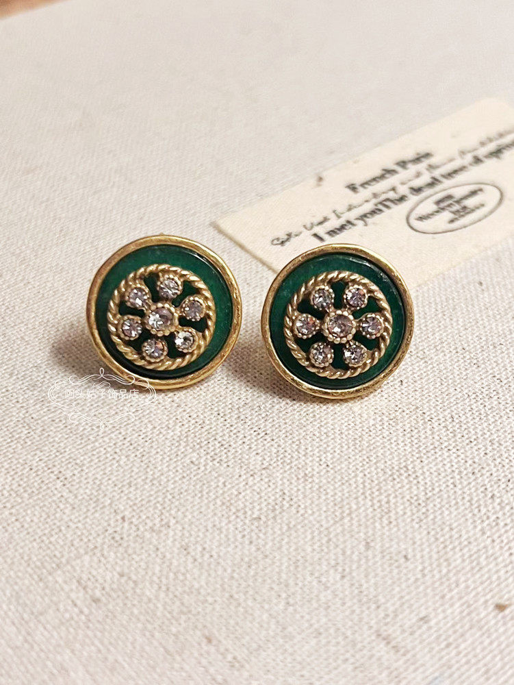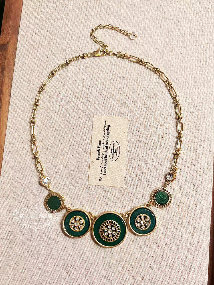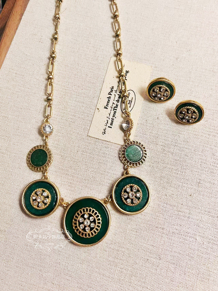 欧美宫廷风中古vintage复古气质做旧绿色圆形石头闪钻项链耳环女