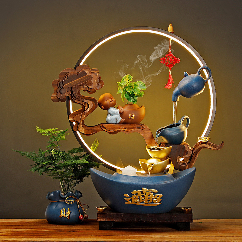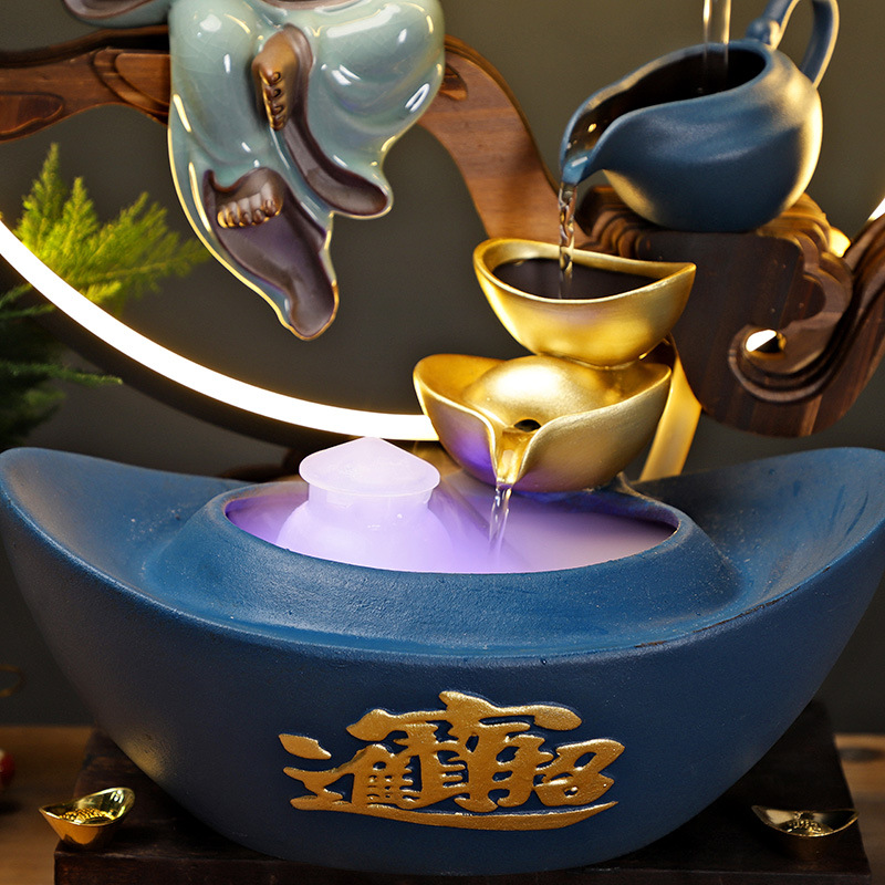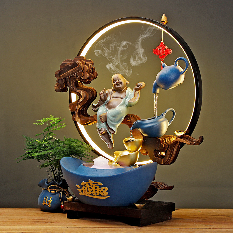 创意家居新品招财进宝弥勒玄关桌面装饰风水轮加湿流水器礼品摆件