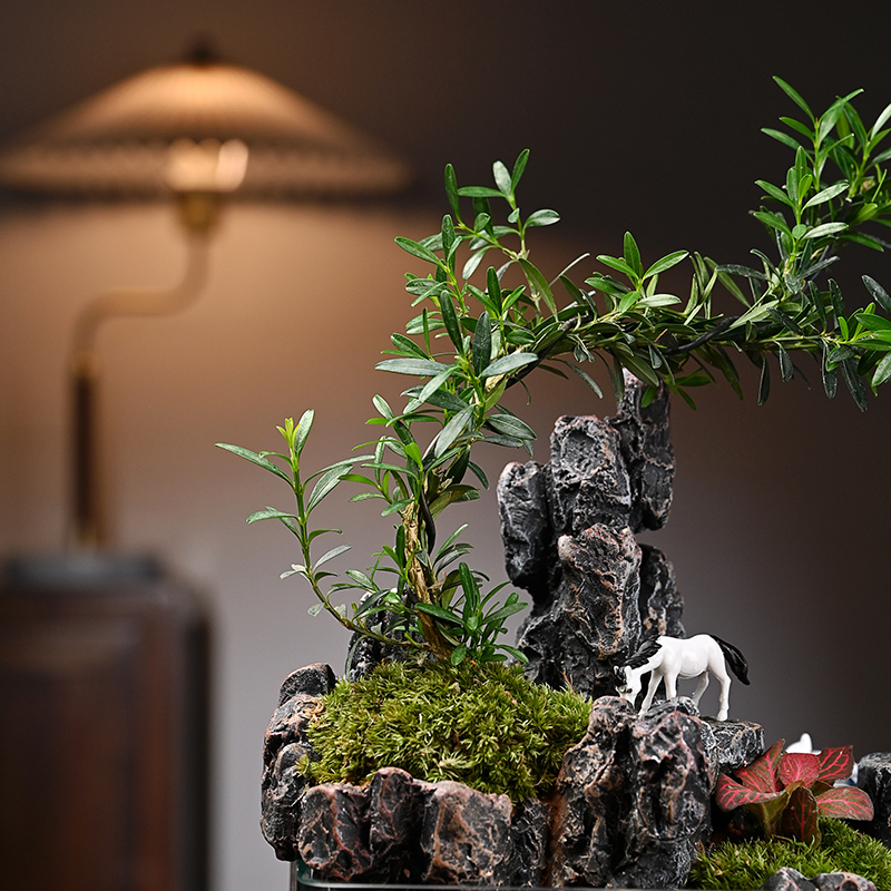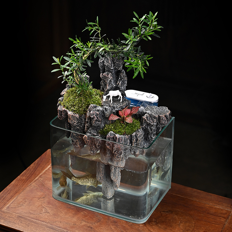 假山流水鱼缸造j景黄杨绿植摆件创意办公室客厅桌面水循环开业礼