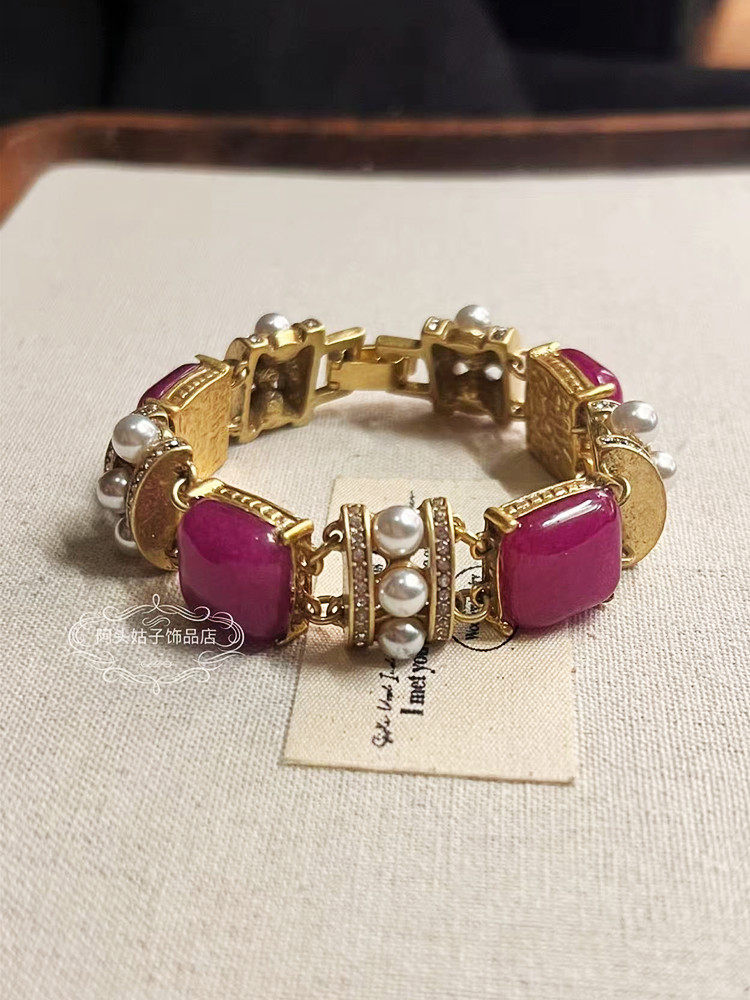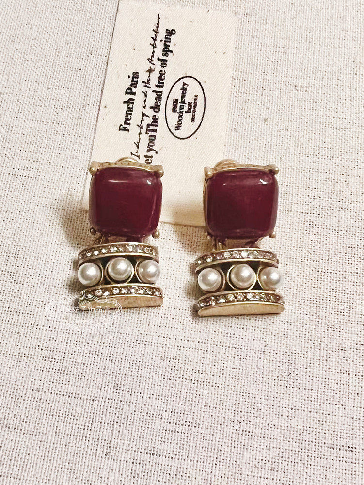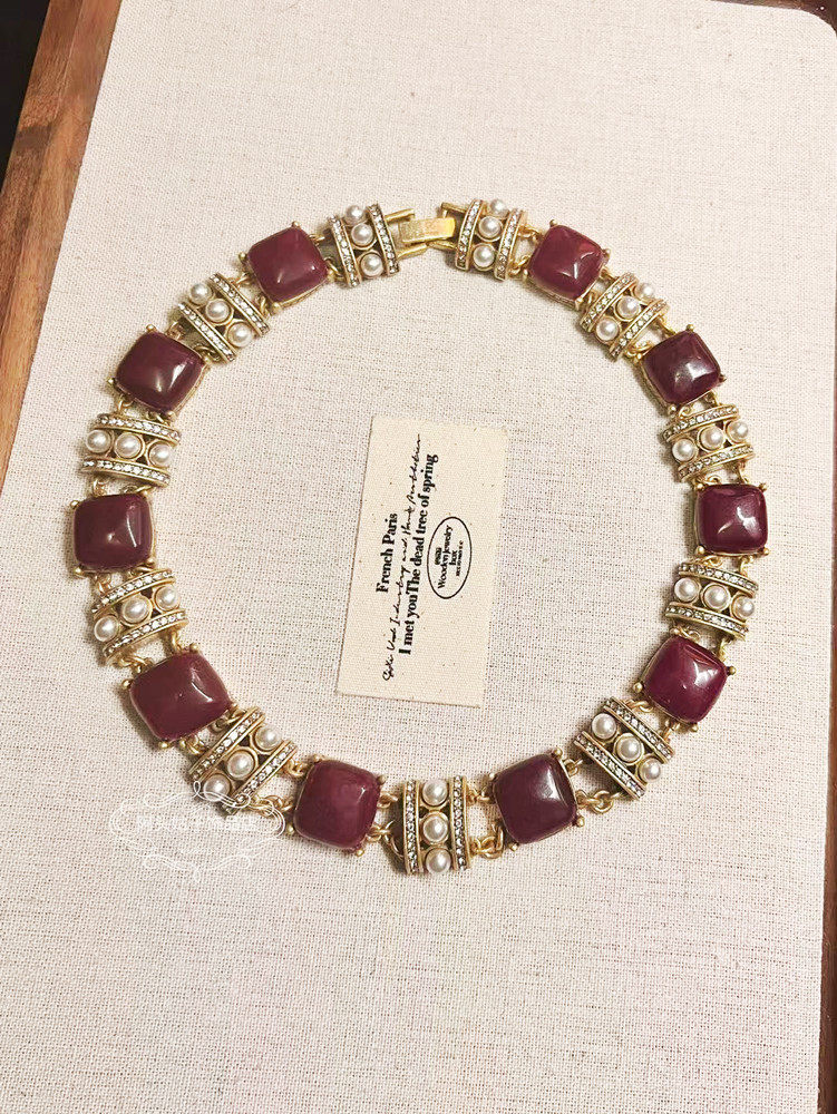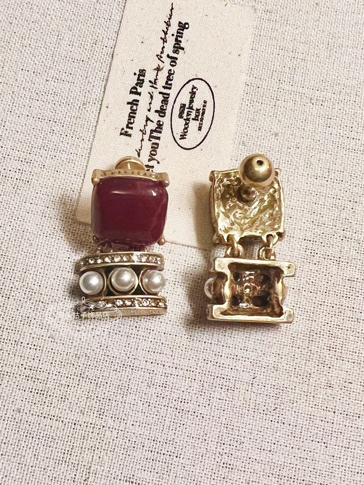 宫廷中古vintage复古气质做旧红色方形天然石珍珠项链耳环手链女