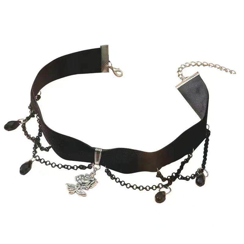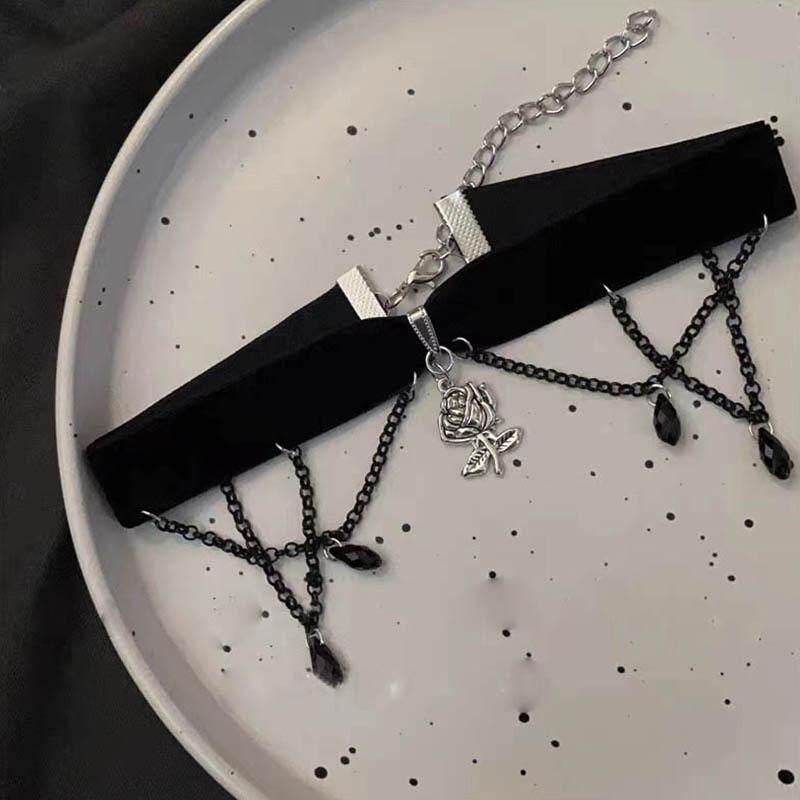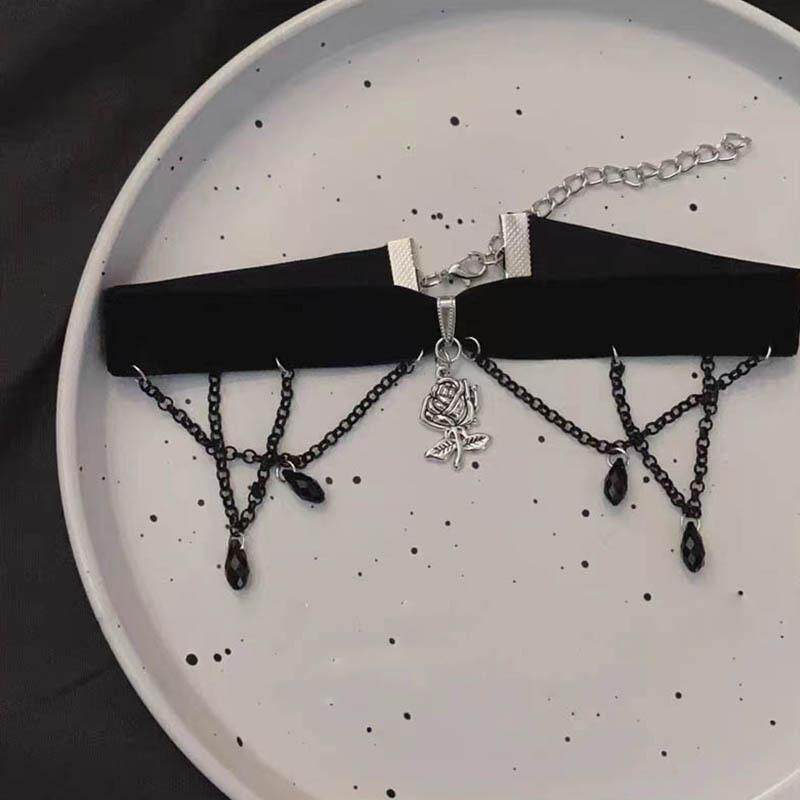 暗黑系哥特山茶花吊坠项圈女黑色流苏绒布choker颈链甜酷辣妹配饰