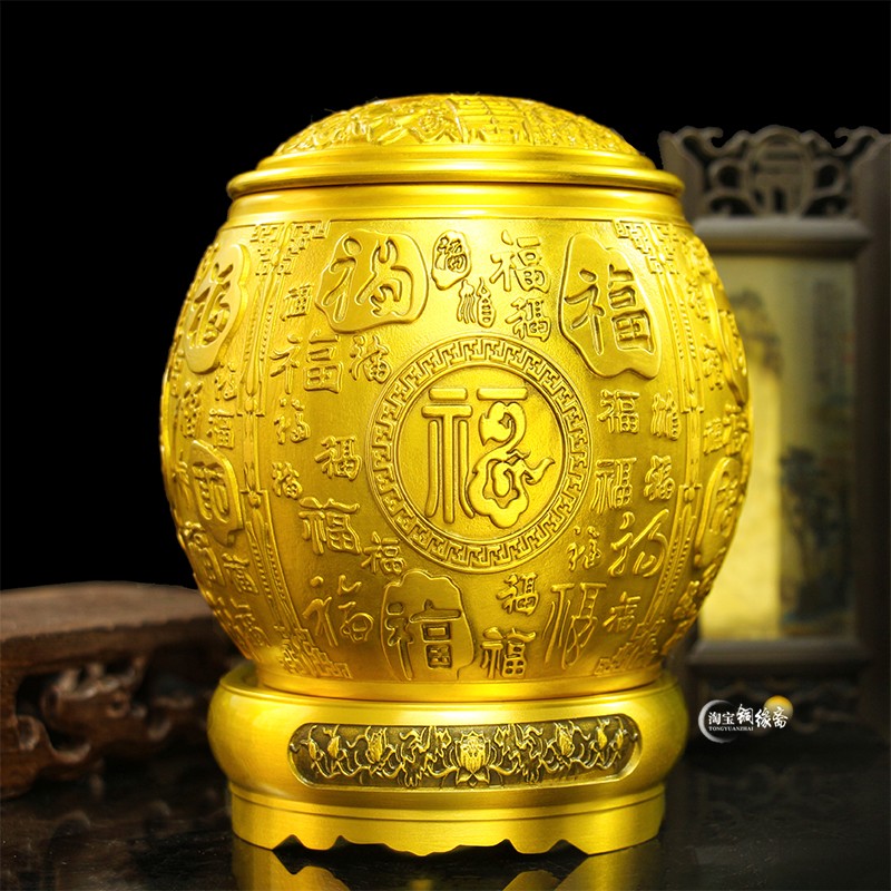 铜百福米缸带盖聚宝缸黄铜茶叶罐存钱罐仿古金色中式聚宝盆摆件纯