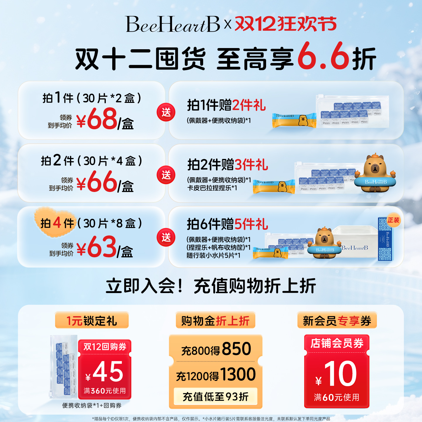 【2盒囤货装】BeeHeartB日抛60片38%/55%含水隐形眼镜透明蜜心妍