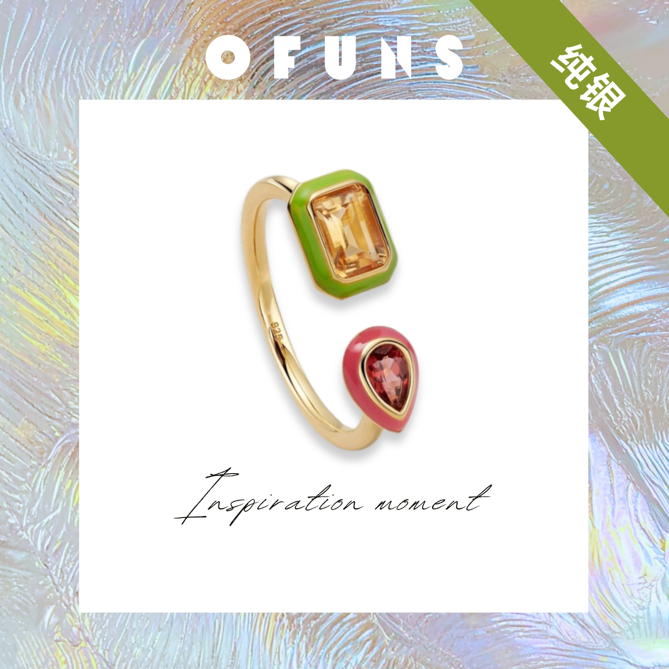 OFUNS 925纯银镀金小方块水滴双色珐琅滴釉戒指女时尚个性食指戒