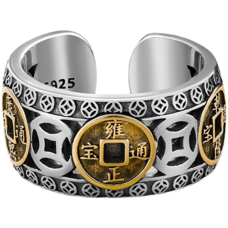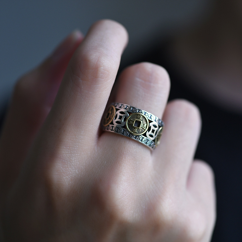 复古做旧招财转运五帝钱铜钱币戒指男女款中国风潮流个性S925纯银