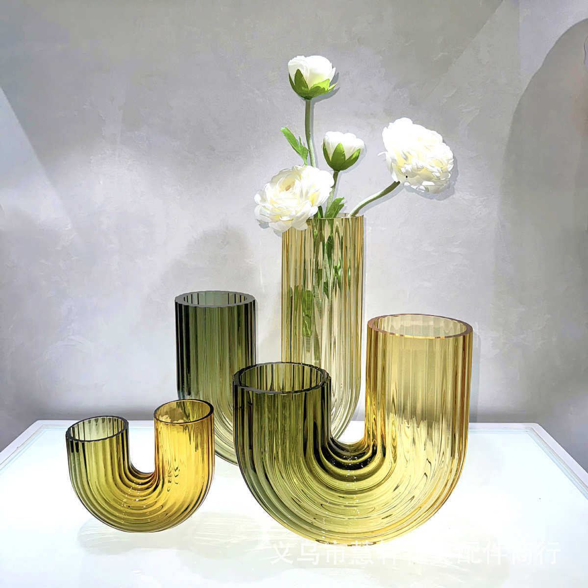 现代艺术简约北欧式灰色U形 轻奢玻璃花器摆件样板房装饰品插花器
