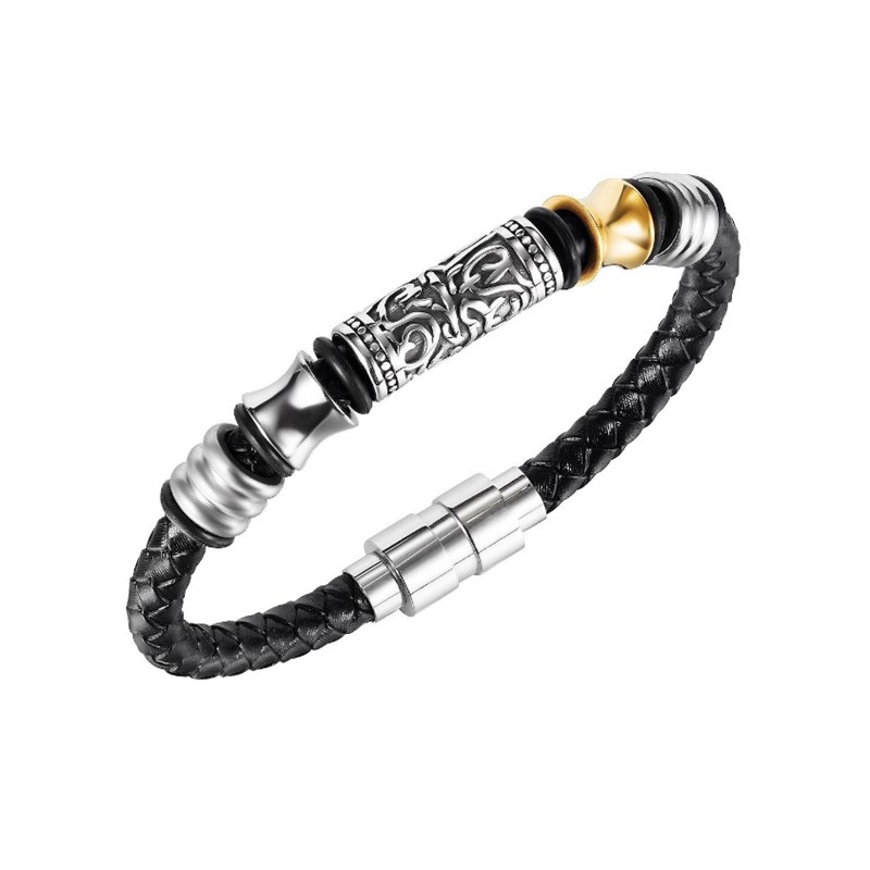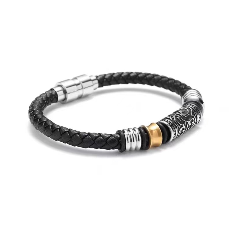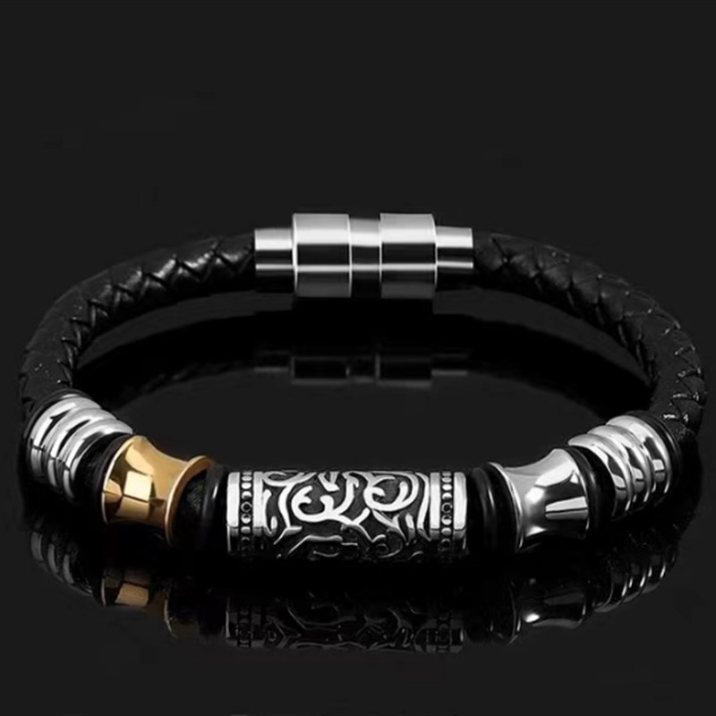 复古编织金属磁吸雕花手链男士百搭轻奢小众黑皮绳手镯设计感礼物