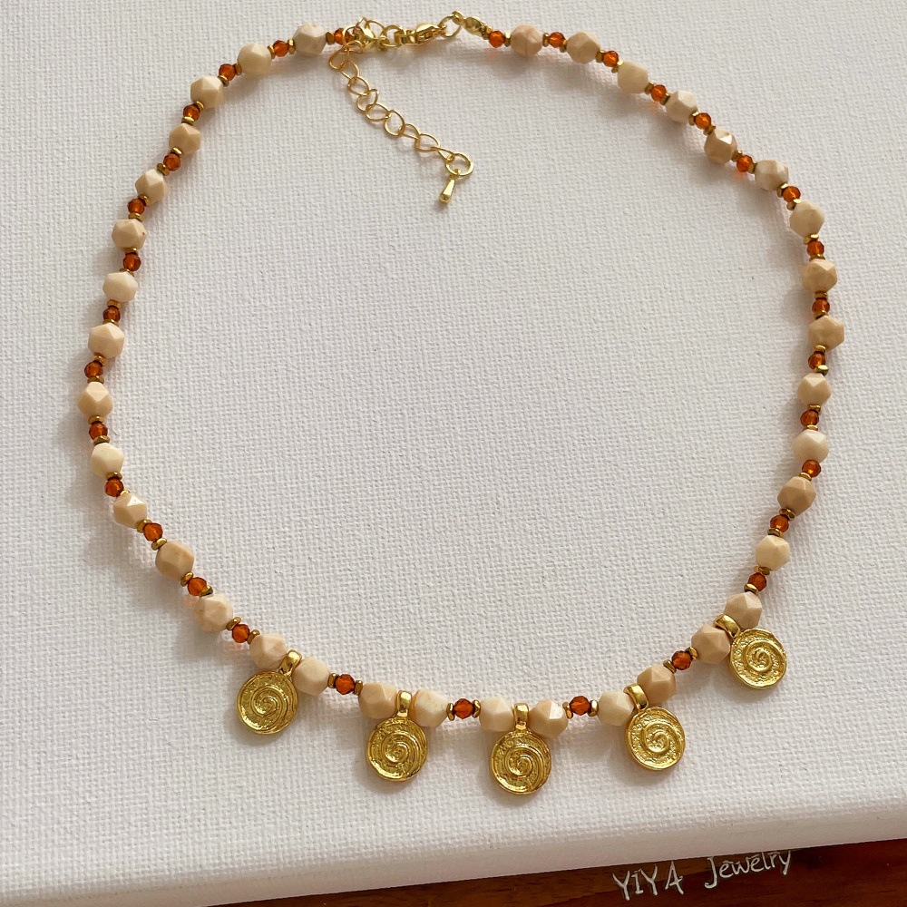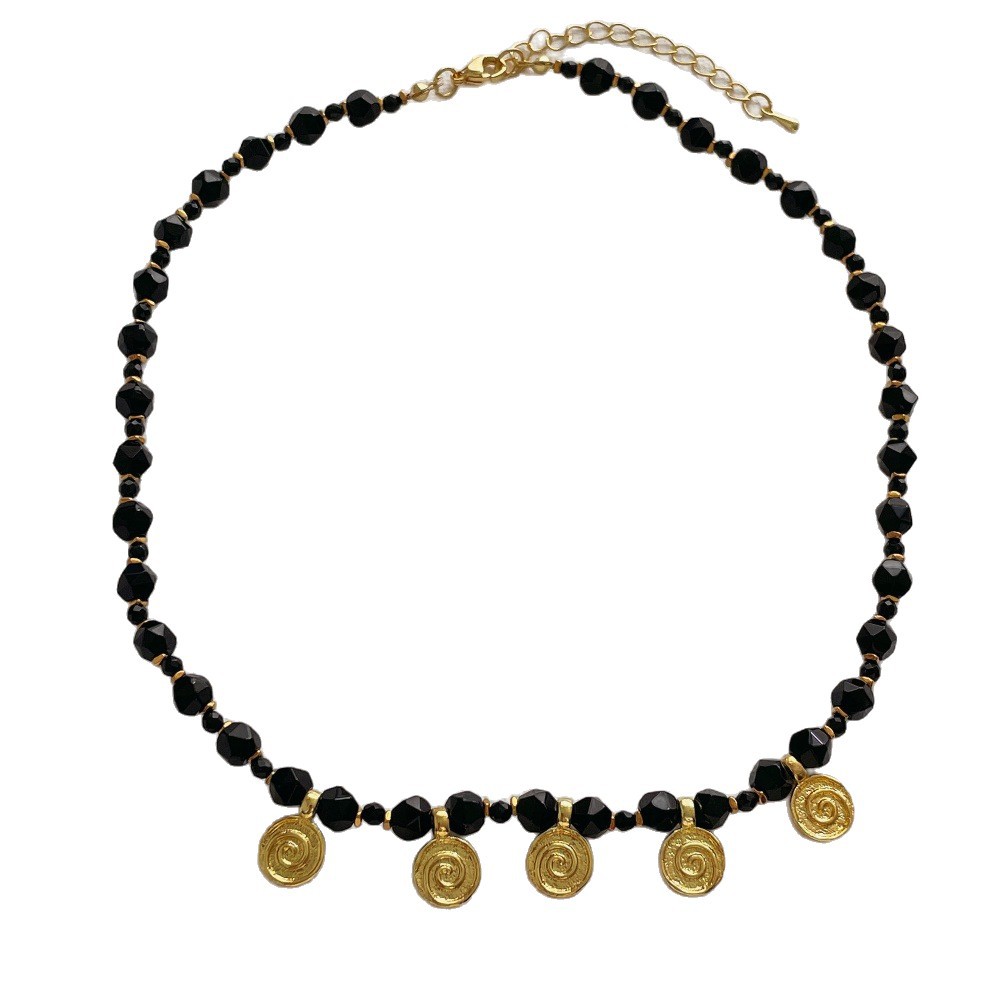 小众复古多元素螺旋吊坠项链女小香风设计黑金配色串珠颈链卫衣链