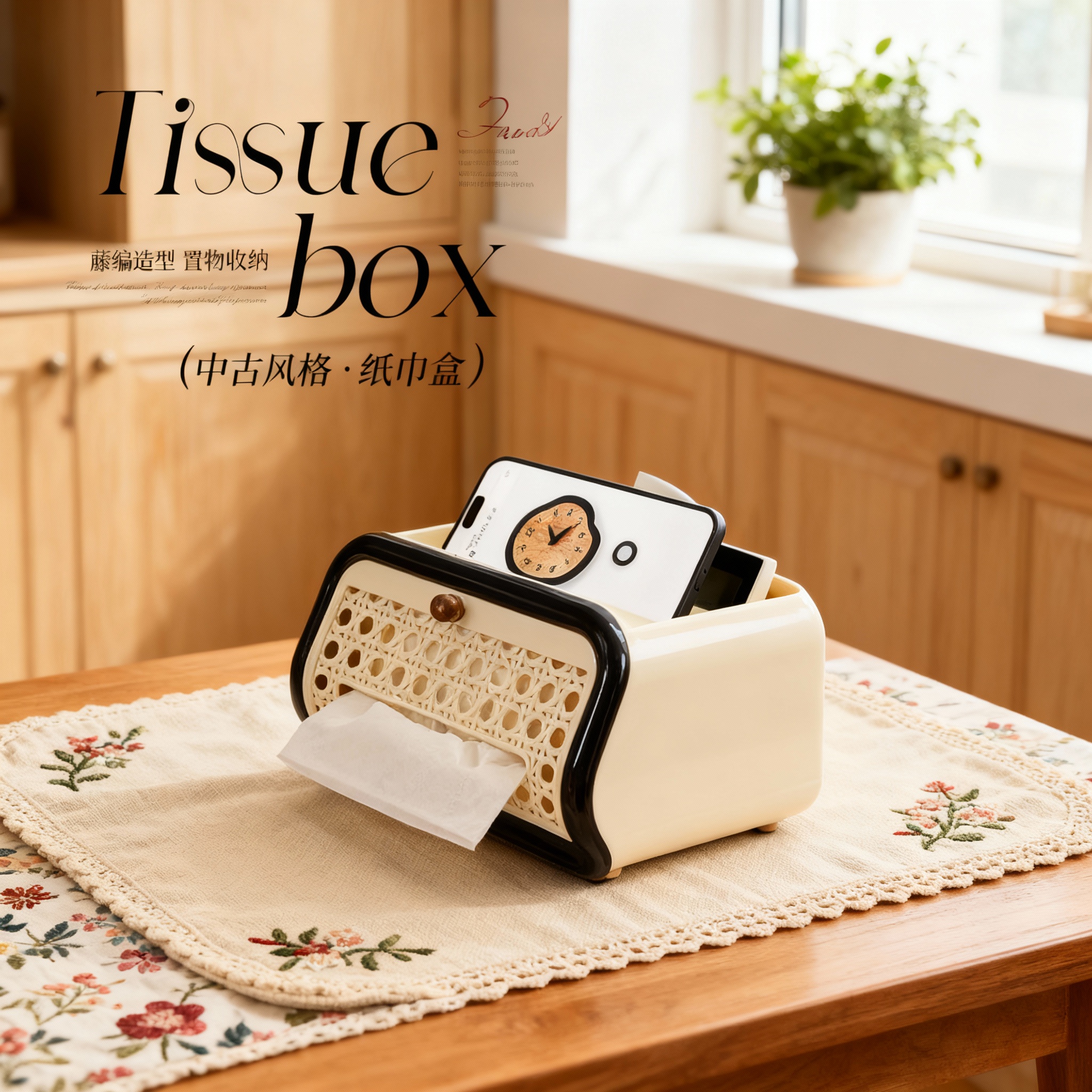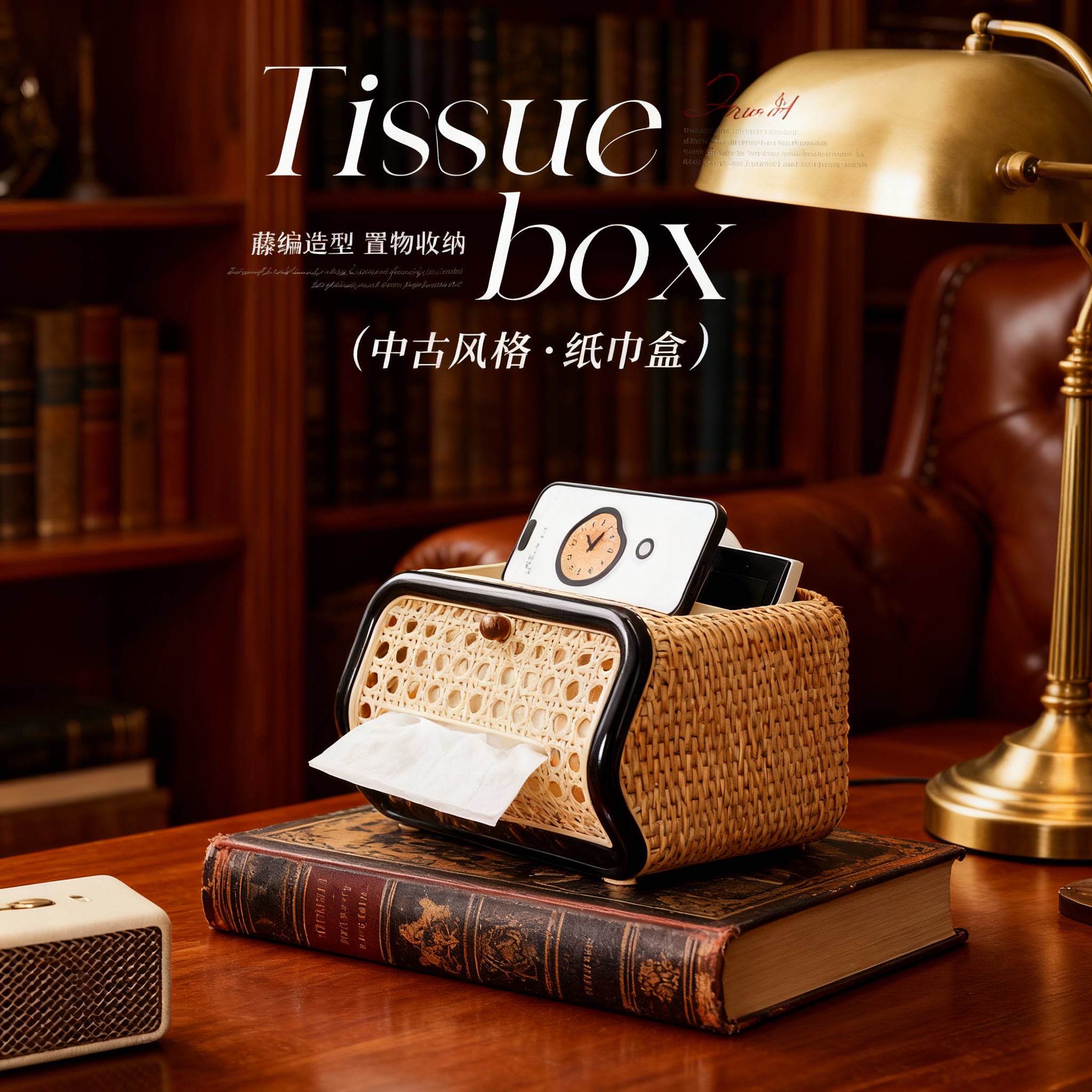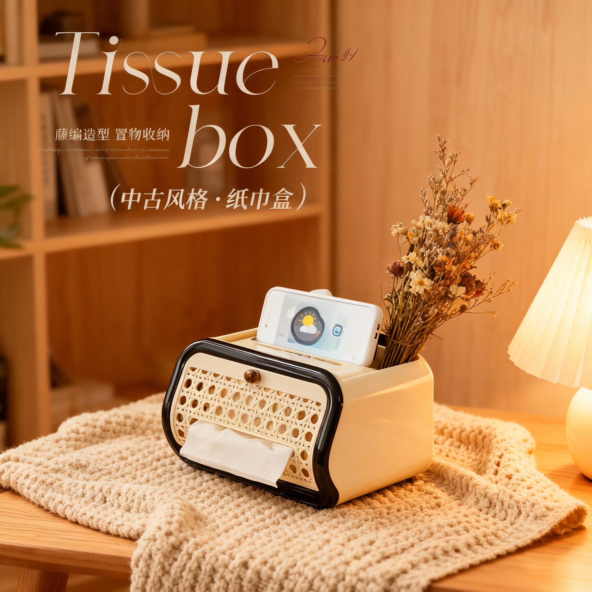 中古风藤编纸巾盒桌面收纳盒多功能手机支架设计感小众家用摆件
