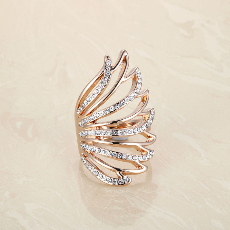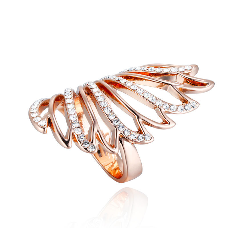 日韩时尚个性食指戒指女满钻玫瑰金色翅膀羽M毛镂空夸张指环开口