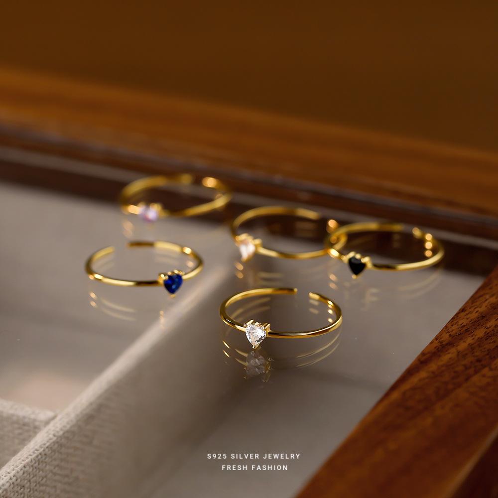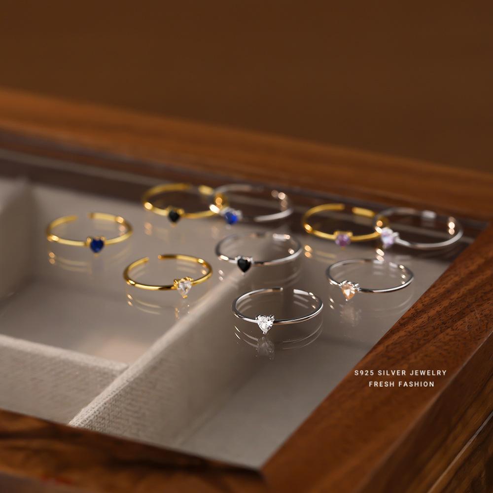 s925纯银爱心白锆戒指女简约小戒圈彩色锆石指环个性开口戒小尾戒