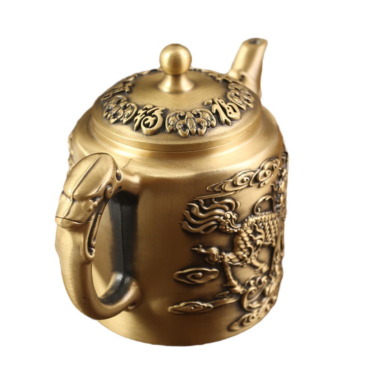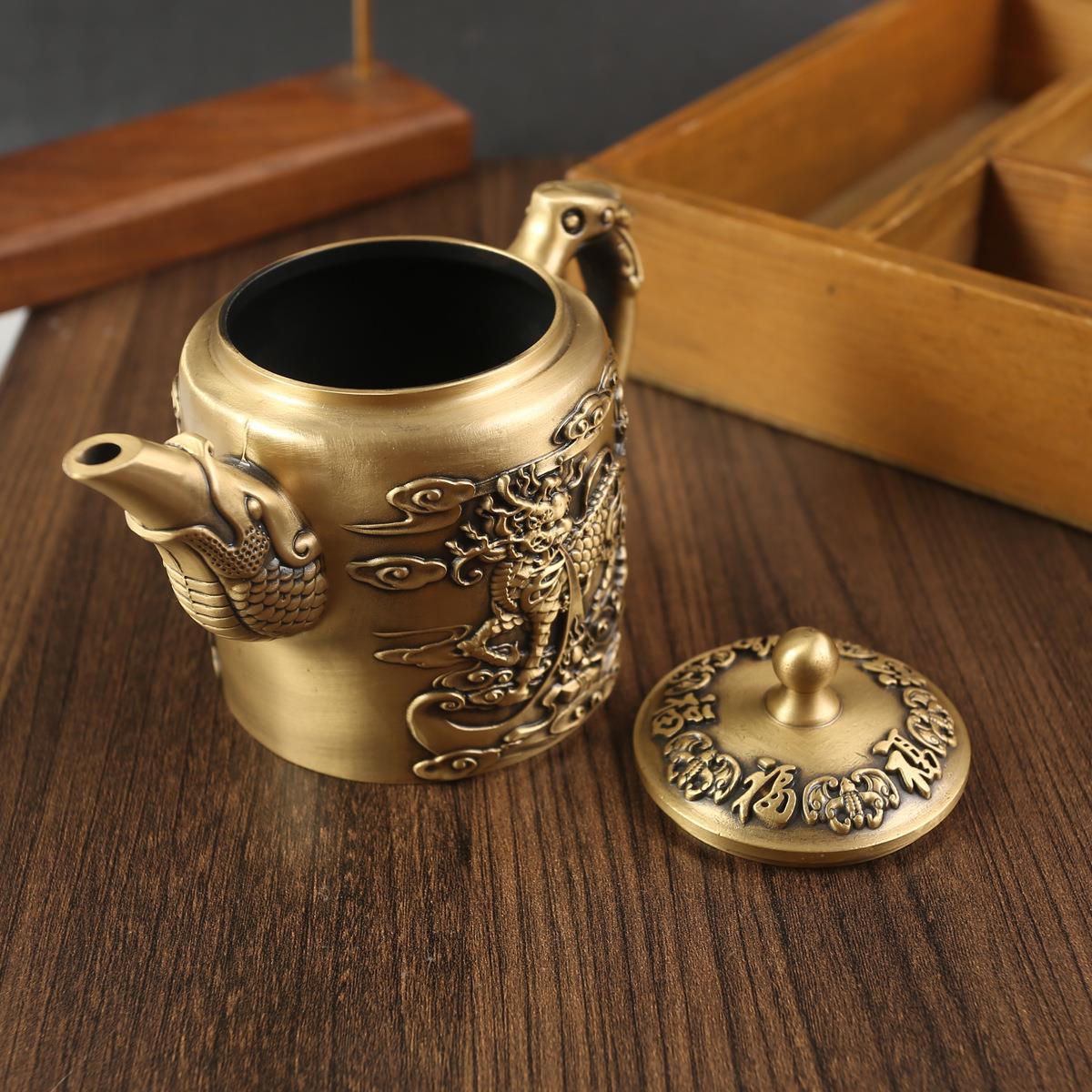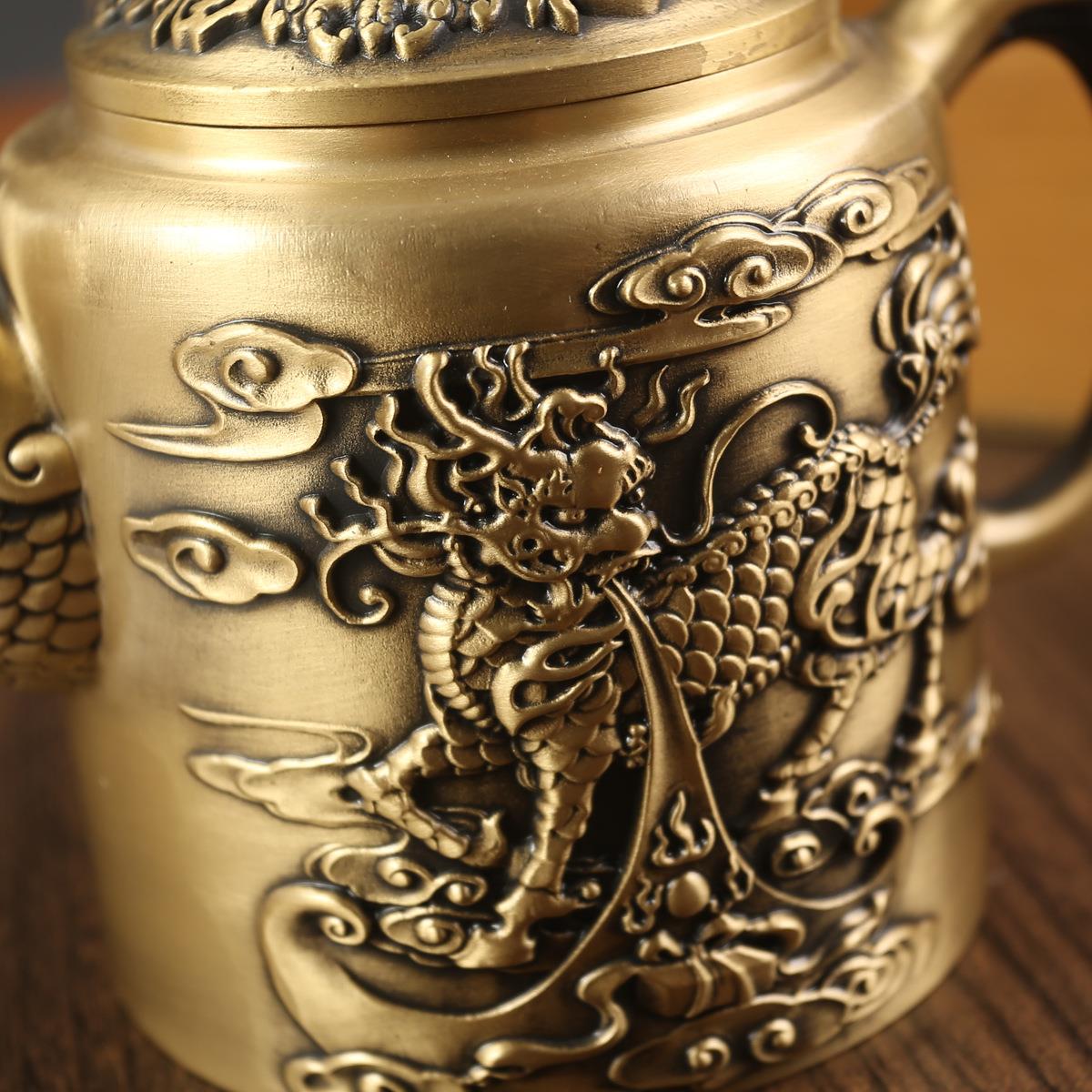 黄铜浮雕麒麟茶壶办公室装饰古玩创意五福水壶茶具纯铜工艺品摆件