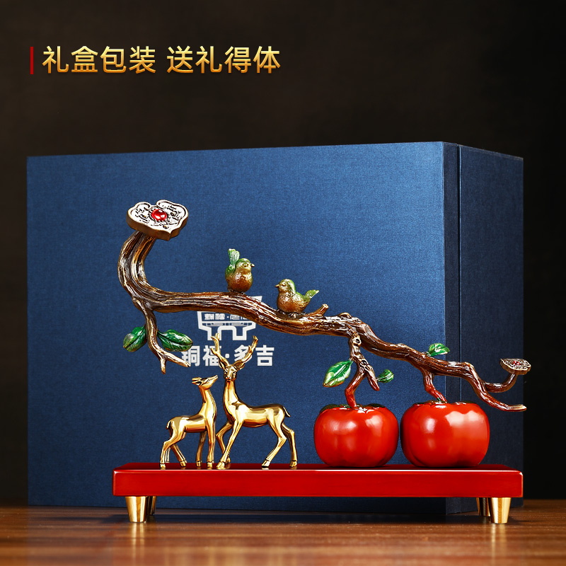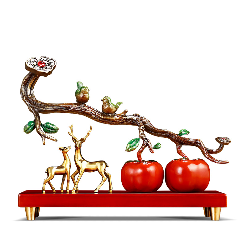 柿柿如意玉如意摆件麋鹿柿子全铜工艺品客厅高端大气乔迁新居礼品