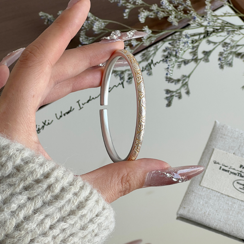 一十七手作「喜至福来」福禄足银999.9实心开口古法描金纯银手镯