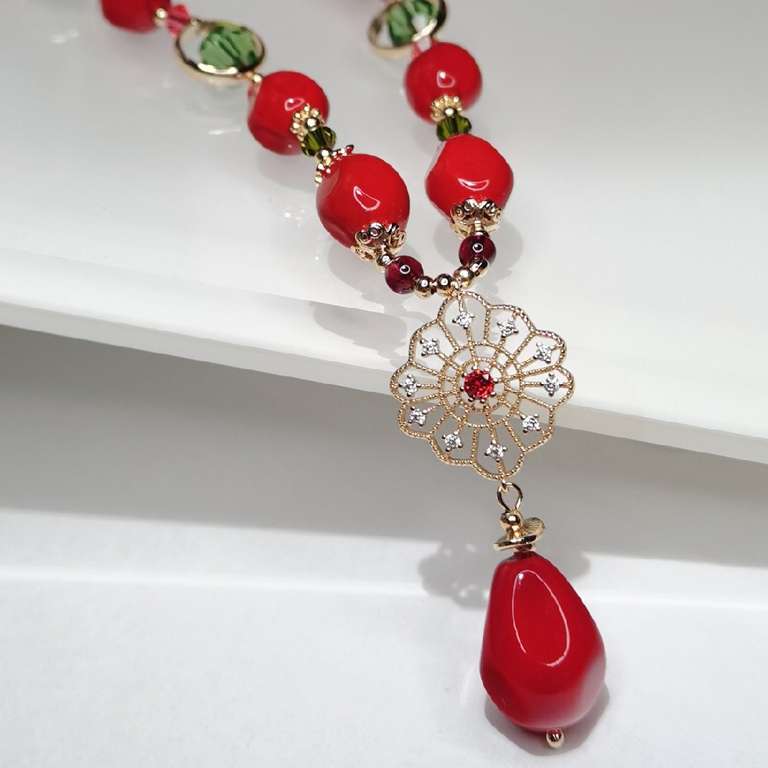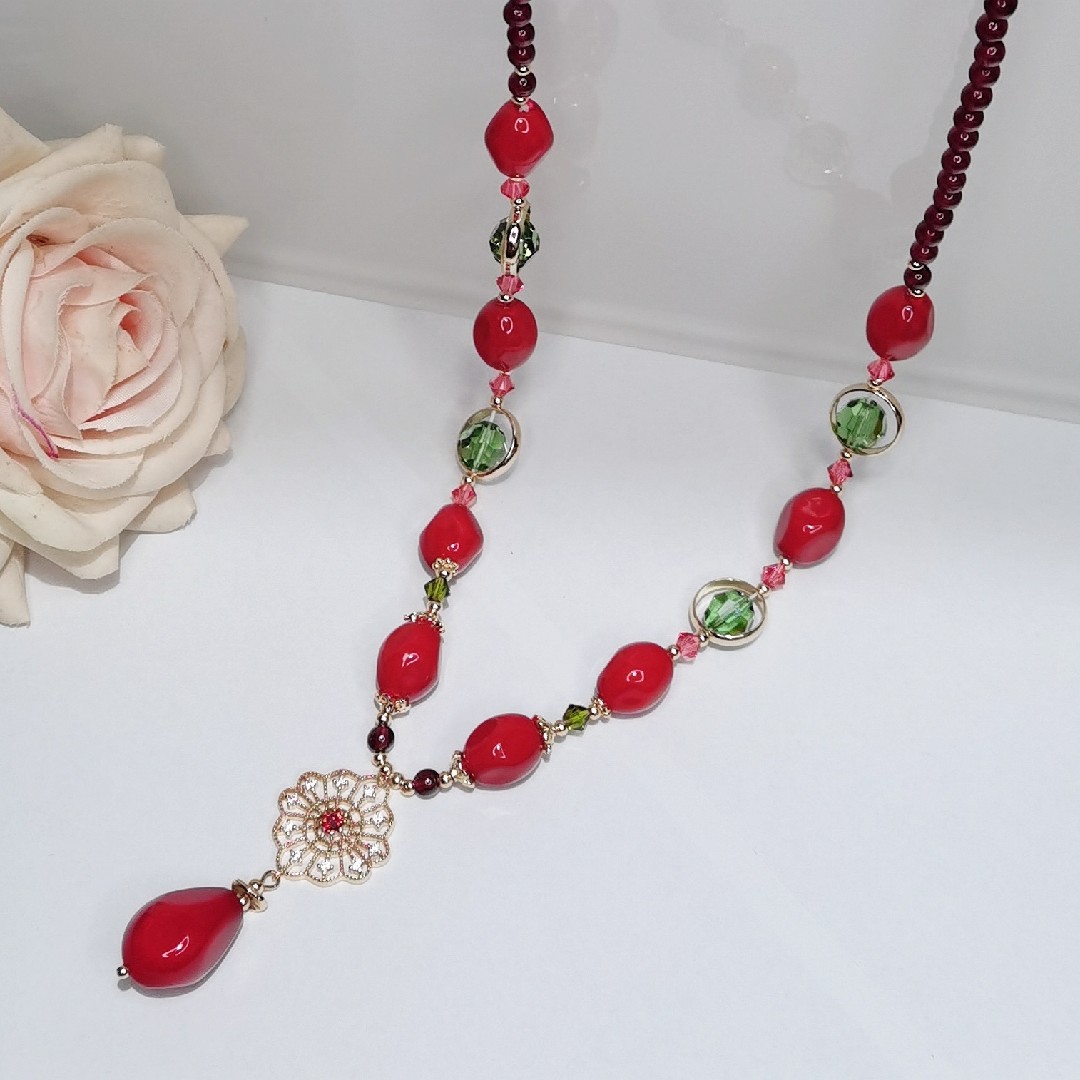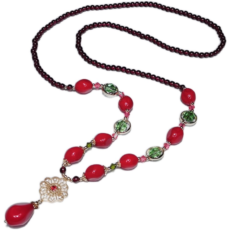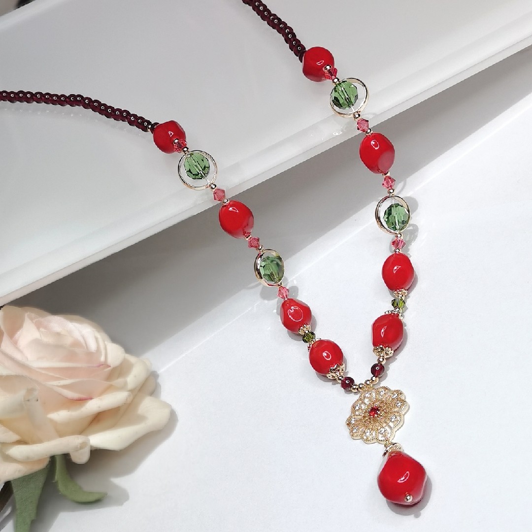 原创天然石榴石毛衣链奥地利水晶红贝珠长款高级感项链女气质吊坠