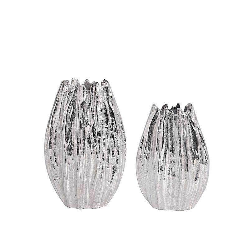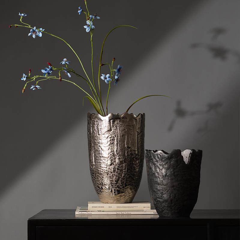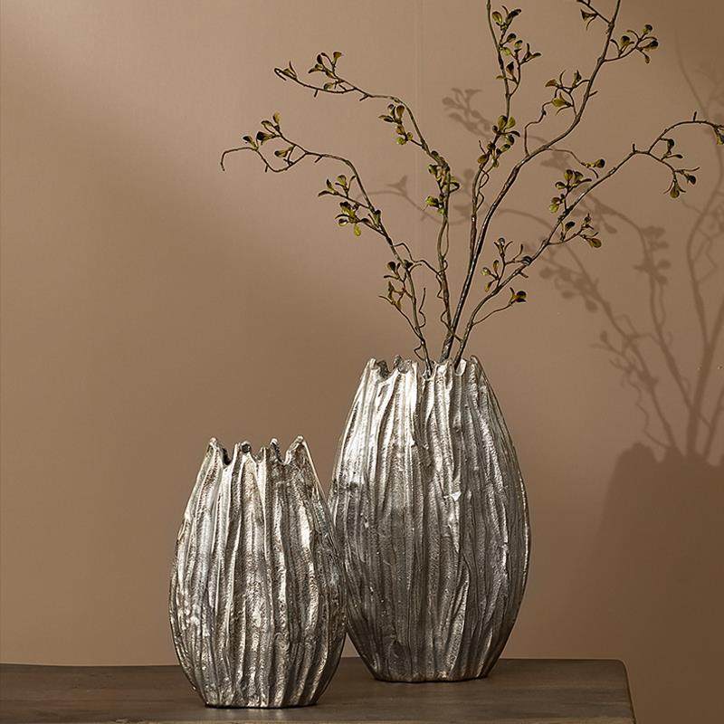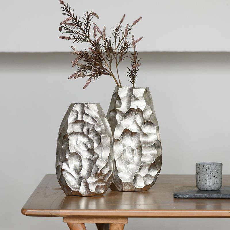 欧式现代简约铝制金属锤纹花器银色花瓶摆件样板间酒店客厅装饰品