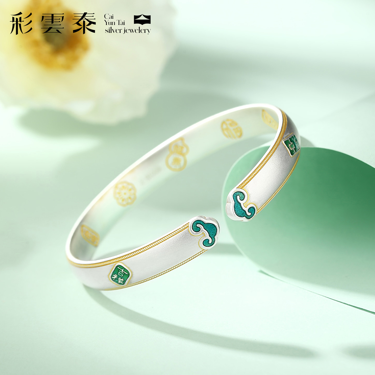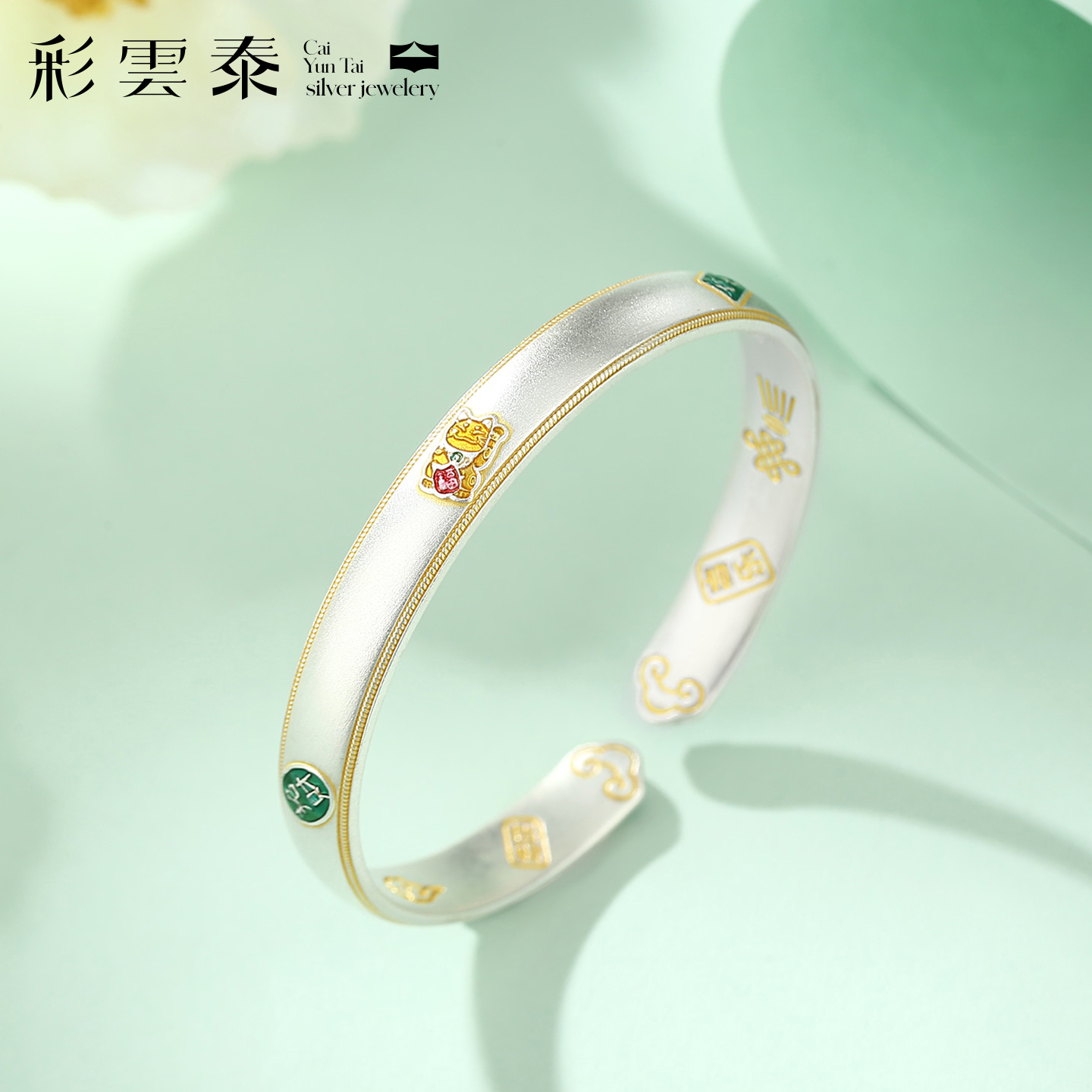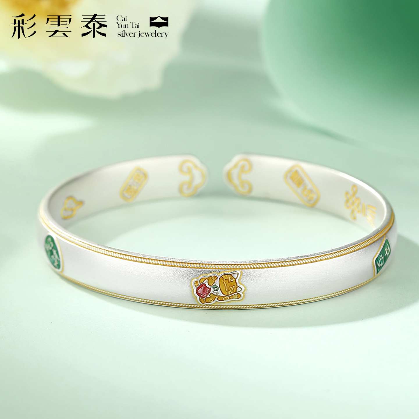 彩云泰足银9999招财猫纯银手镯女款珐琅彩描金国风银镯子送女朋友