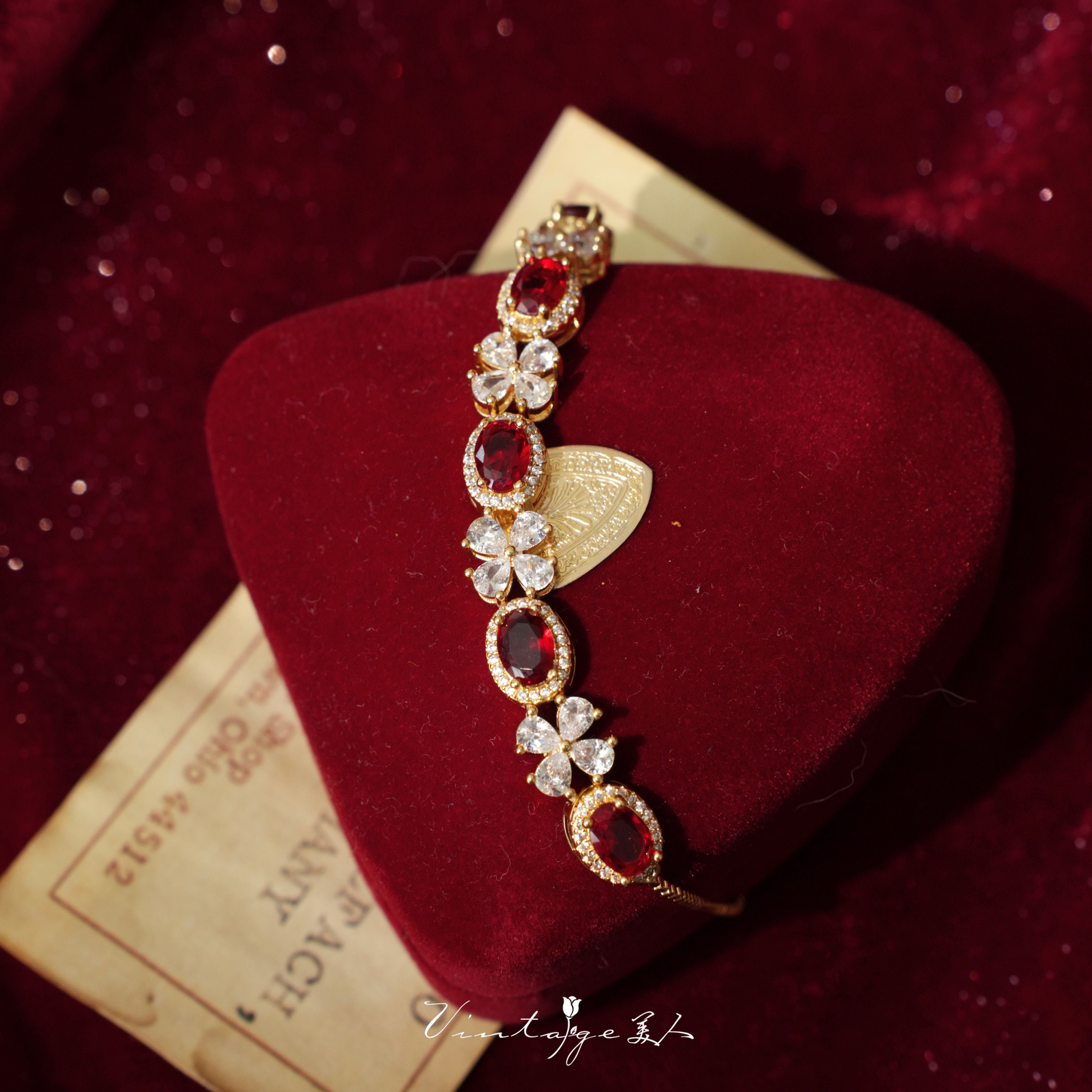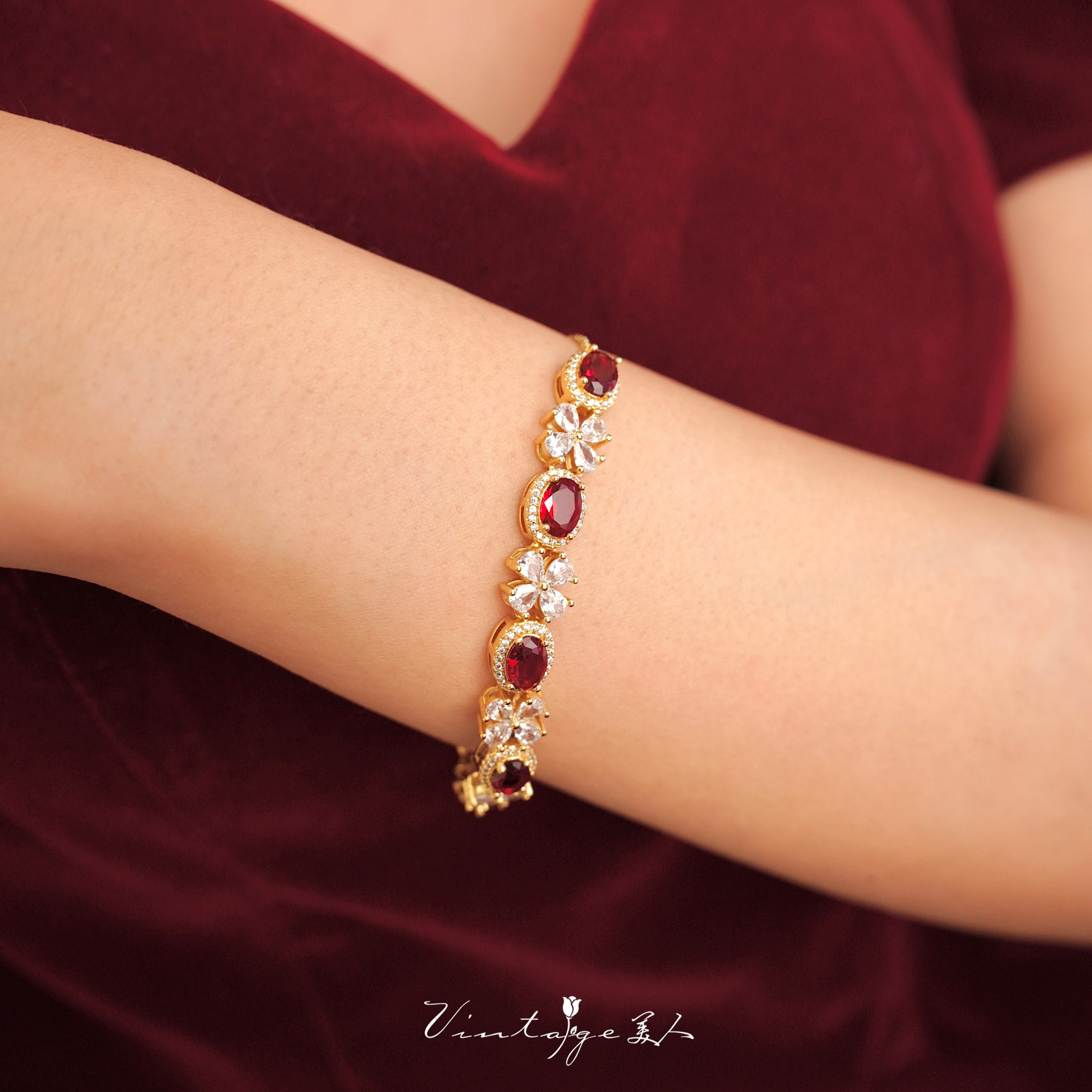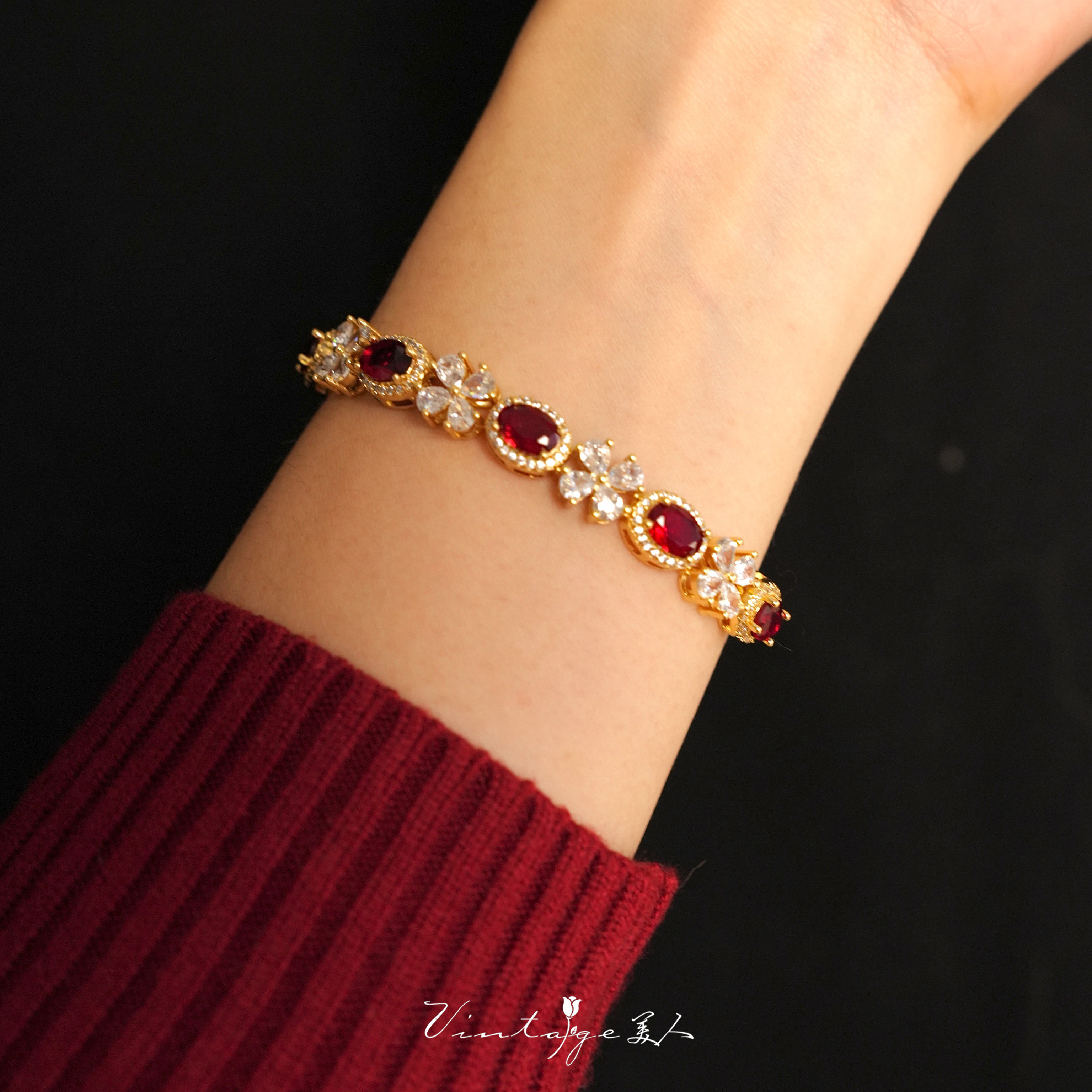 「约瑟芬舞会」法式宫廷闪耀高级百搭酒红显白锆石抽拉可调节手链