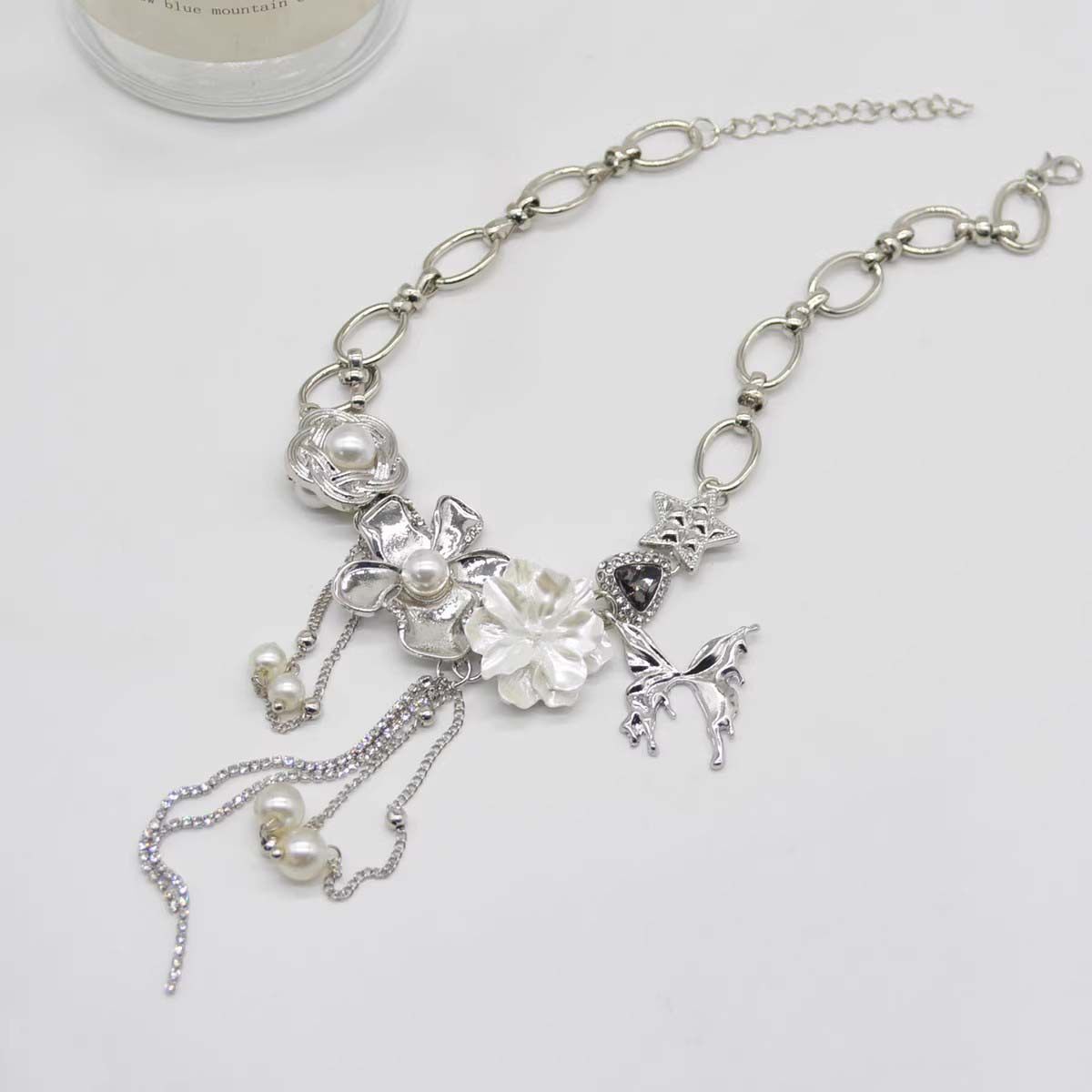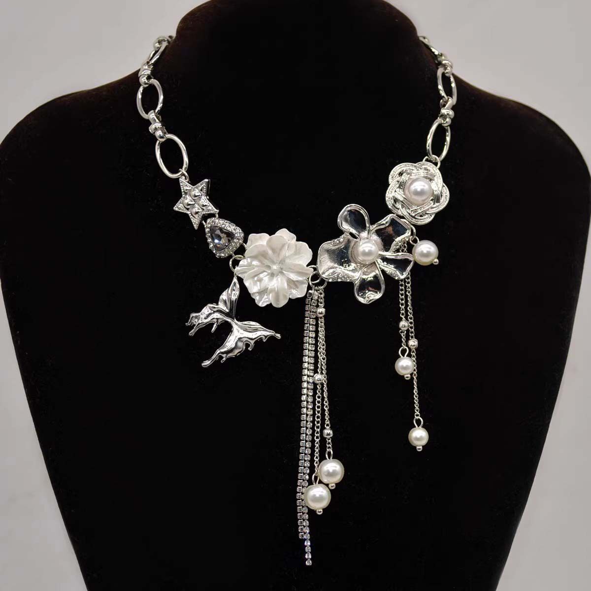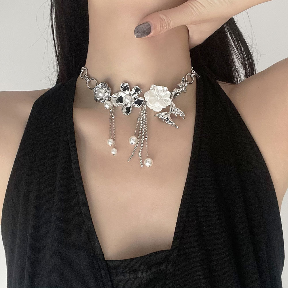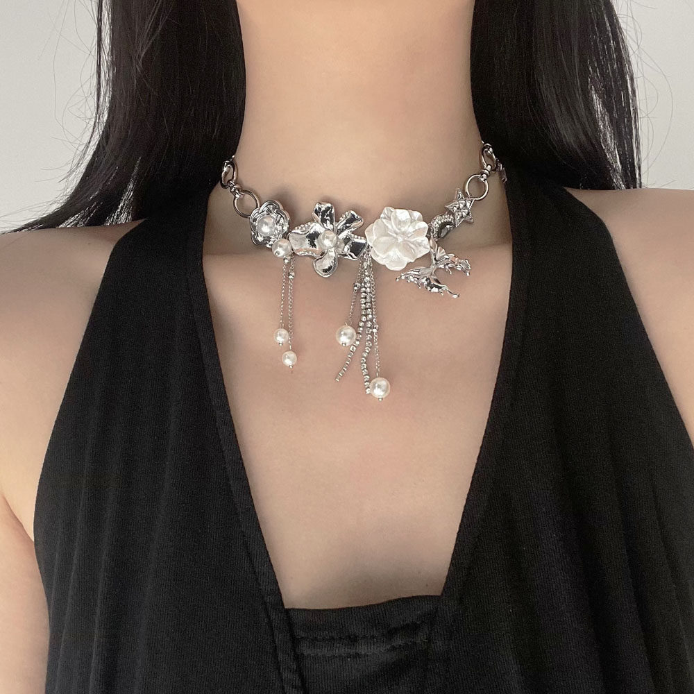 当前位置:首页>商品详情>法式白色山茶花金属蝴蝶珍珠流苏项链女复古小众高级感choker颈链