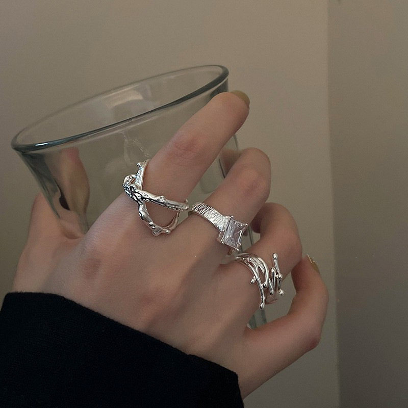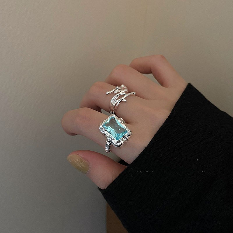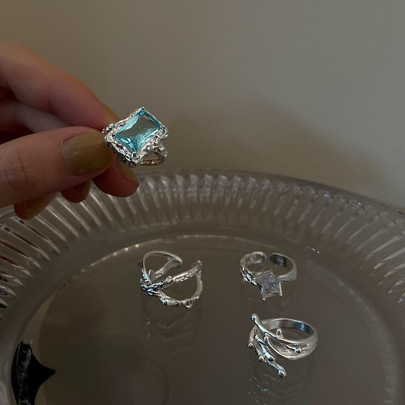 日韩S925银蓝色锆石戒指女复古时尚个性线条交叉开口指环食指戒潮