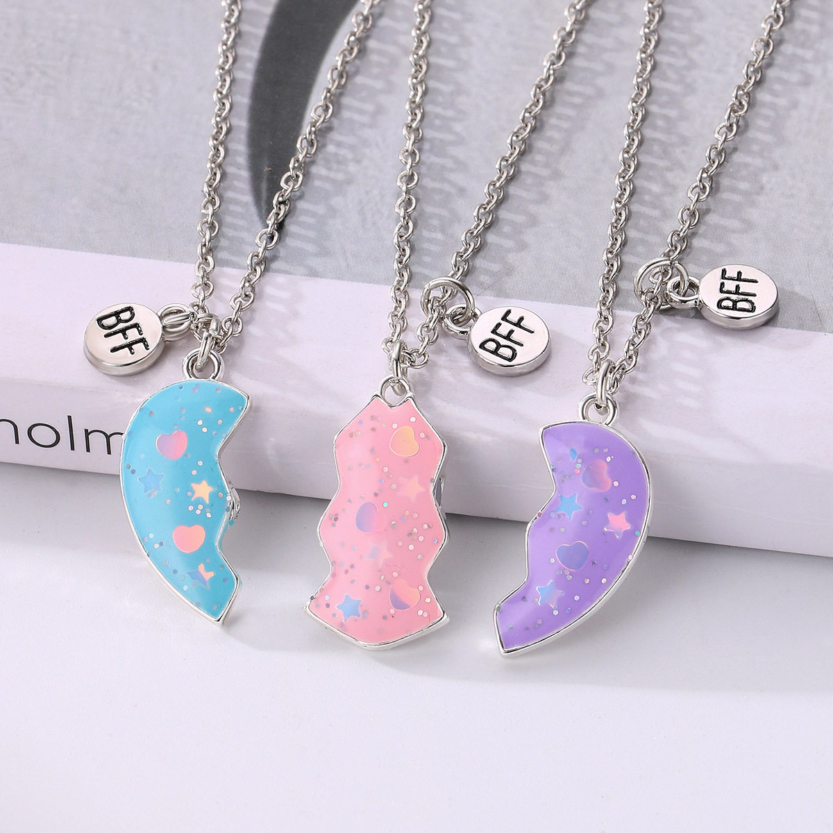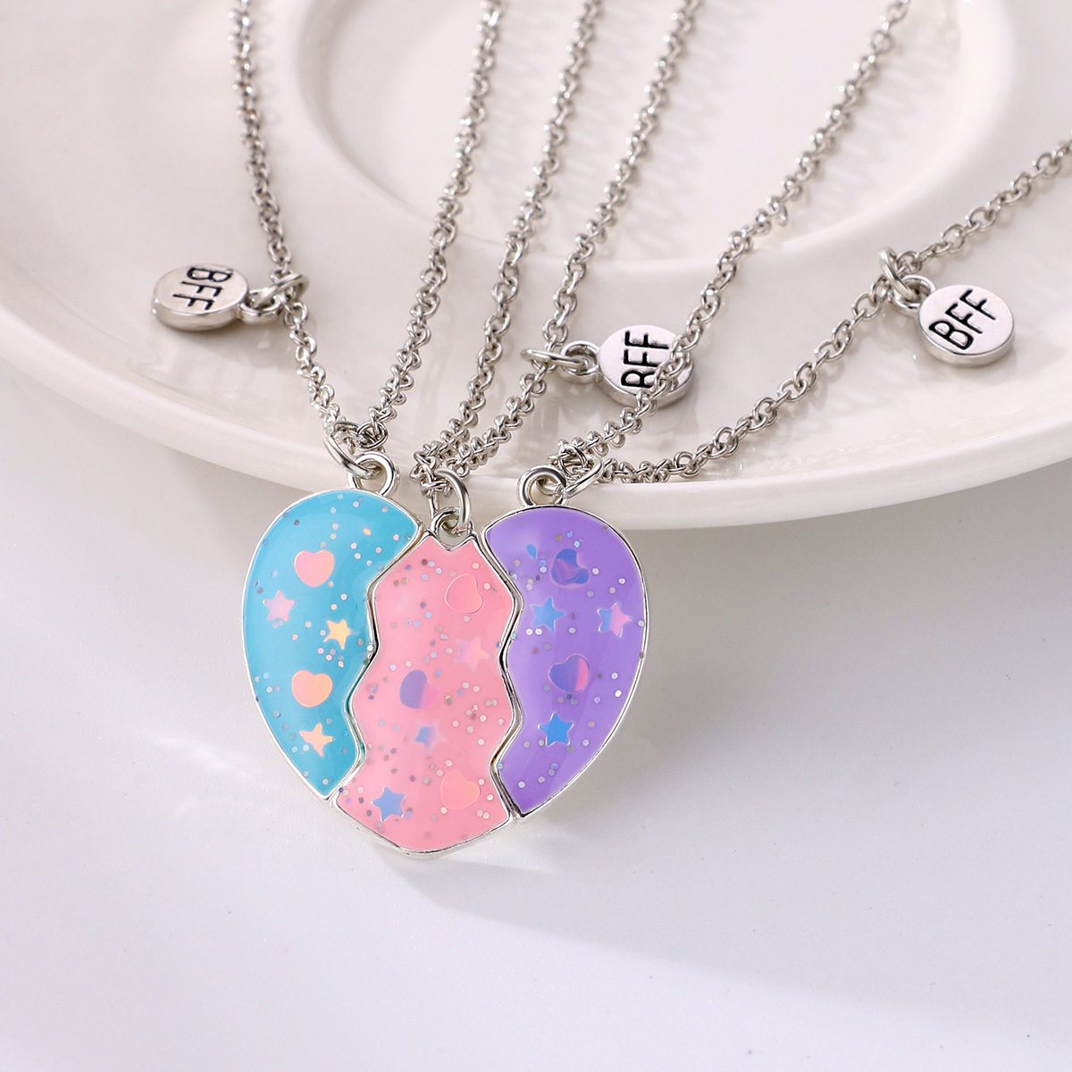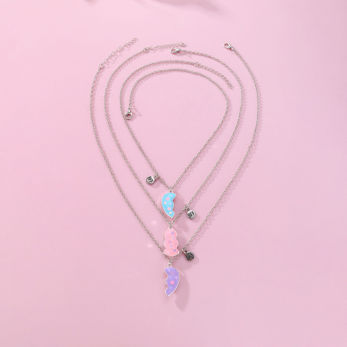 蓝色粉色紫色拼接爱心三人项链磁吸闺蜜学生儿童女童饰品吊坠礼物