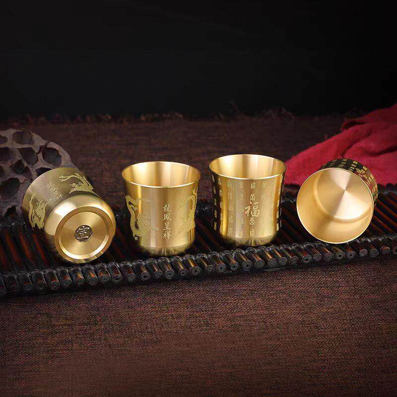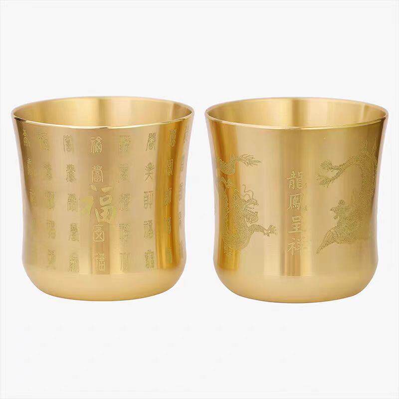 龙凤呈祥杯百福杯激光雕刻复古茶杯酒杯纯黄铜杯摆件黄铜茶桌装饰