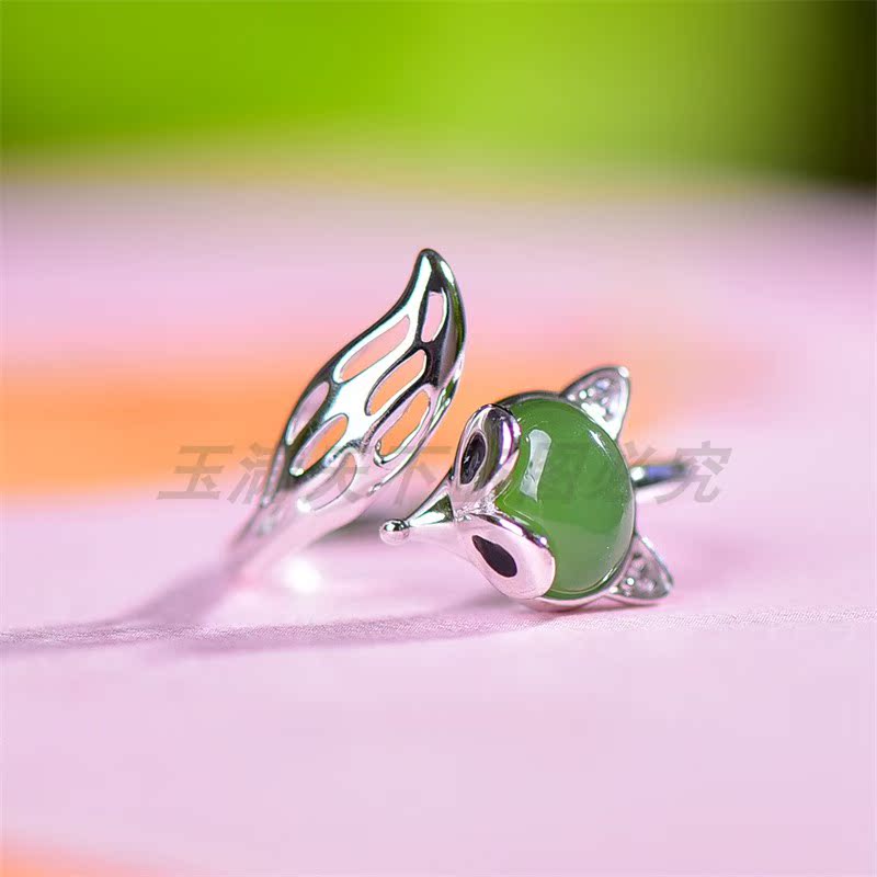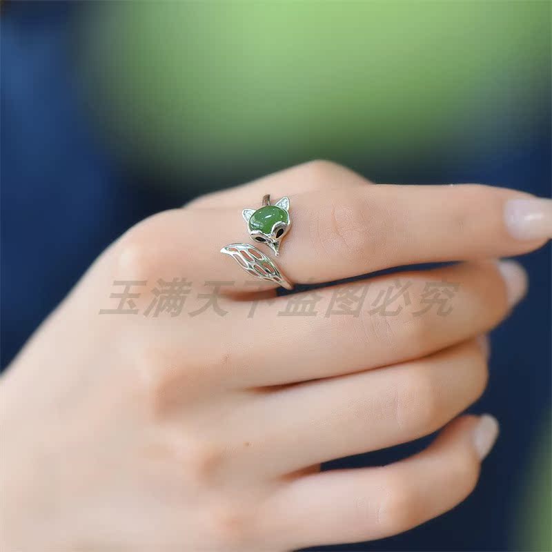 新疆天然和田玉碧玉圆蛋面狐狸戒指925银指环女款玉石可调节戒圈