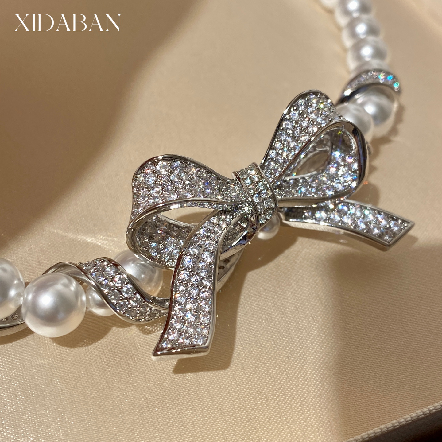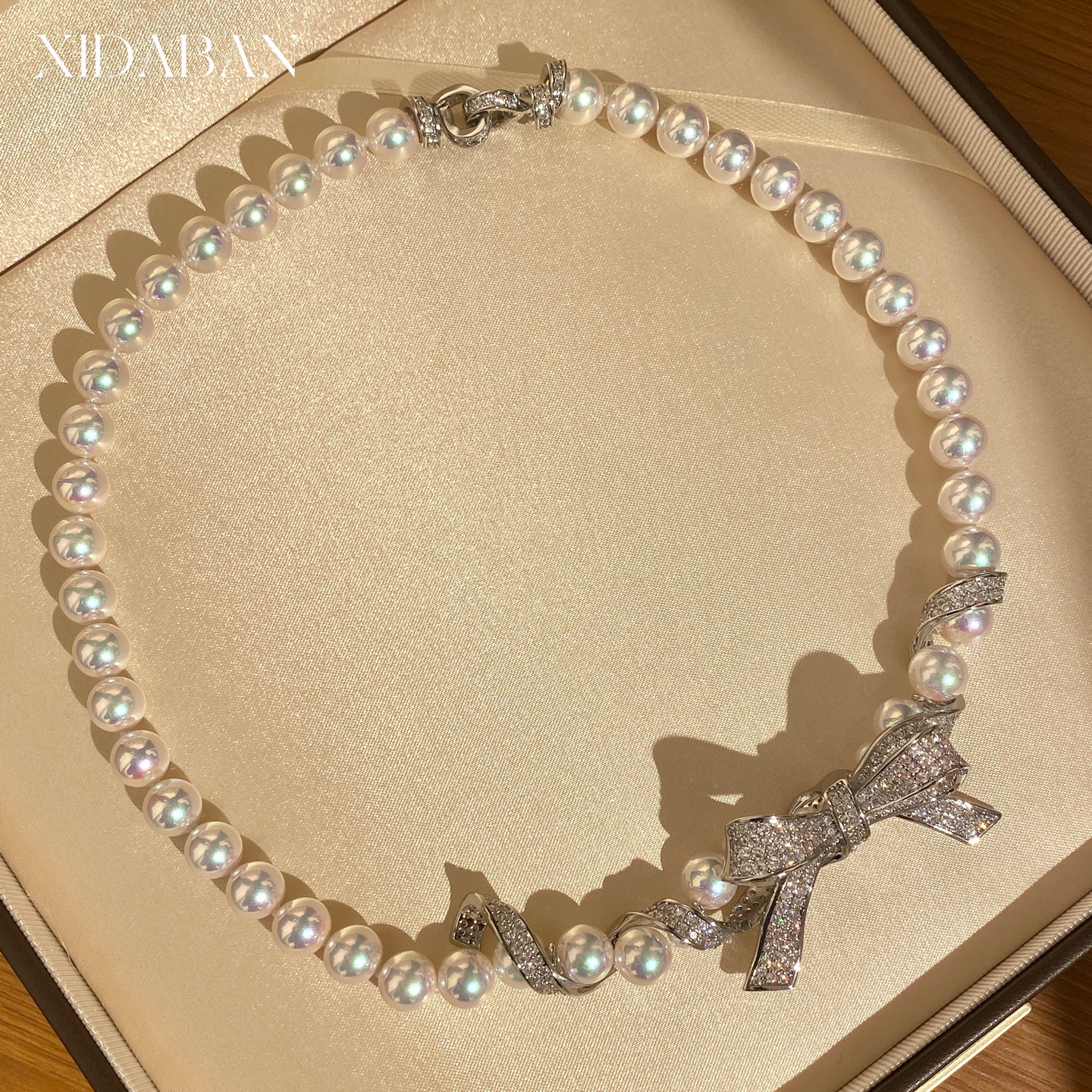 法式蝴蝶结丝带澳白珍珠项链轻奢高级天女Akoya满钻缠绕吊坠颈链