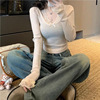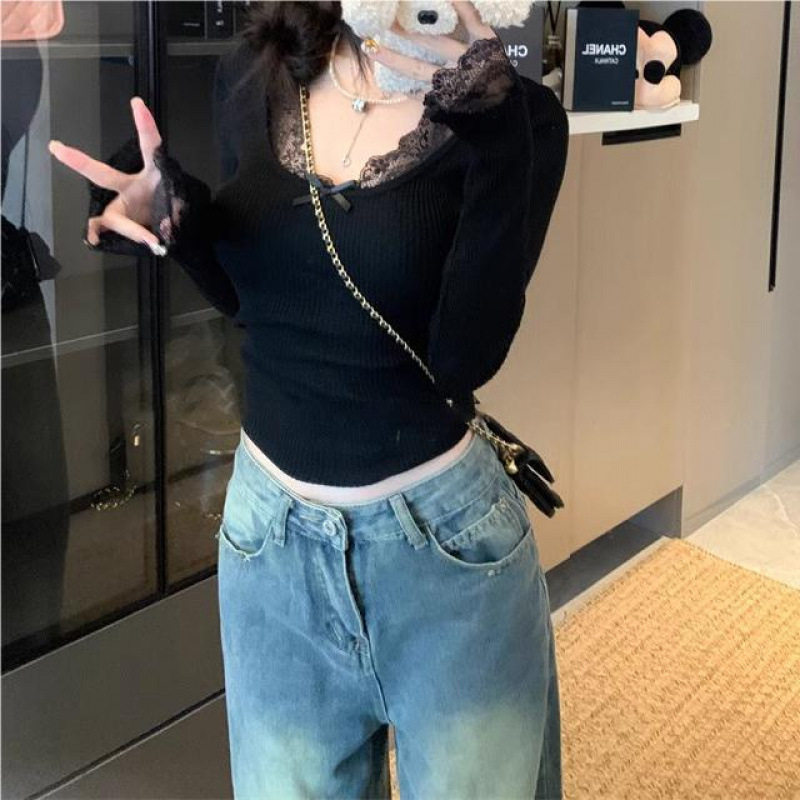 温柔风蝴蝶结蕾丝拼接长袖针织衫女早秋新款百搭修身针织上衣