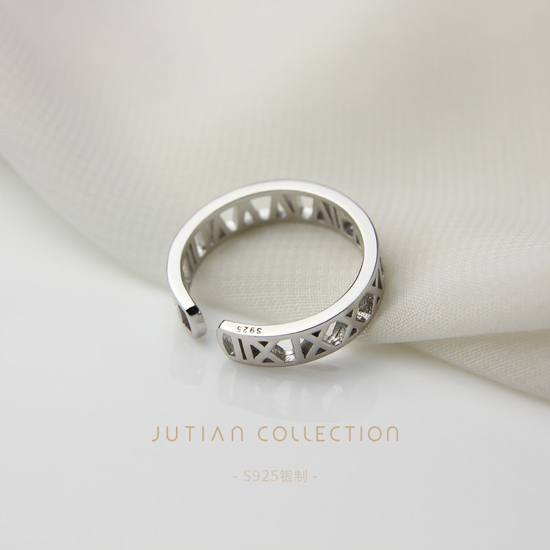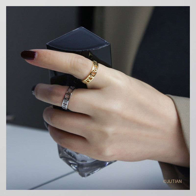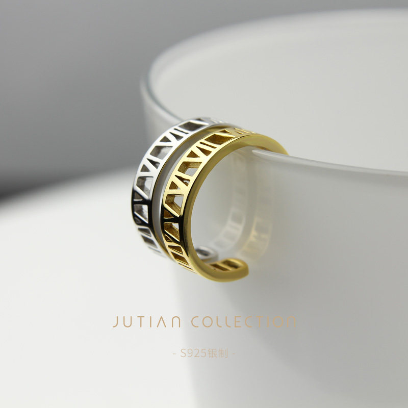 JUTIAN 罗马数字镂空纯银戒指INS个性男女简约金色开口可调节指环